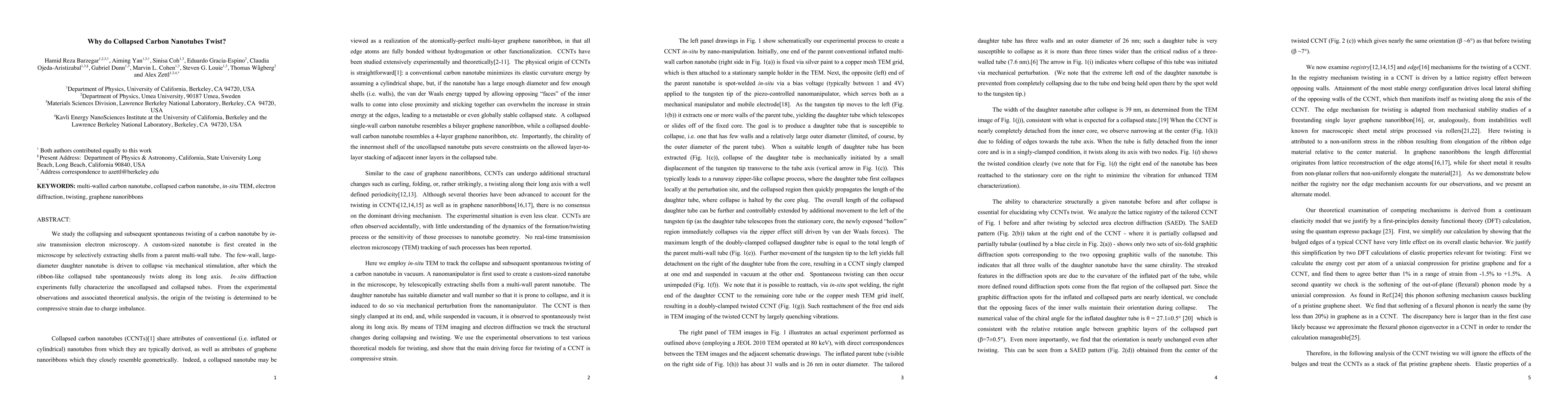Researchers used transmission electron microscopy to study a carbon nanotube that collapsed and twisted after being mechanically stimulated. The twisting was found to be caused by compressive strain due to charge imbalance.