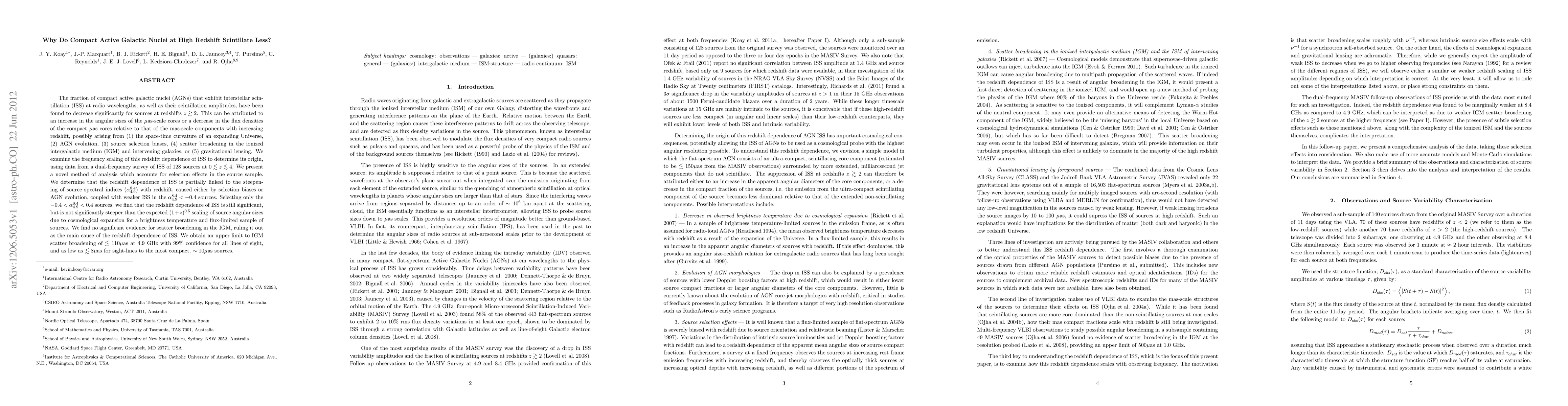 The fraction of compact active galactic nuclei (AGNs) that exhibit interstellar scintillation (ISS) at radio wavelengths, as well as their scintillation amplitudes, have been found to decrease significantly for sources at redshifts z > 2. This can be attributed to an increase in the angular sizes of the \muas-scale cores or a decrease in the flux densities of the compact \muas cores relative to that of the mas-scale components with increasing redshift, possibly arising from (1) the space-time curvature of an expanding Universe, (2) AGN evolution, (3) source selection biases, (4) scatter broadening in the ionized intergalactic medium (IGM) and intervening galaxies, or (5) gravitational lensing. We examine the frequency scaling of this redshift dependence of ISS to determine its origin, using data from a dual-frequency survey of ISS of 128 sources at 0 < z < 4. We present a novel method of analysis which accounts for selection effects in the source sample. We determine that the redshift dependence of ISS is partially linked to the steepening of source spectral indices ({\alpha}^8.4_4.9) with redshift, caused either by selection biases or AGN evolution, coupled with weaker ISS in the {\alpha}^8.4_4.9 < -0.4 sources. Selecting only the -0.4 < {\alpha}^8.4_4.9 < 0.4 sources, we find that the redshift dependence of ISS is still significant, but is not significantly steeper than the expected (1+z)^0.5 scaling of source angular sizes due to cosmological expansion for a brightness temperature and flux-limited sample of sources. We find no significant evidence for scatter broadening in the IGM, ruling it out as the main cause of the redshift dependence of ISS. We obtain an upper limit to IGM scatter broadening of < 110\muas at 4.9 GHz with 99% confidence for all lines of sight, and as low as < 8\muas for sight-lines to the most compact, \sim 10\muas sources.