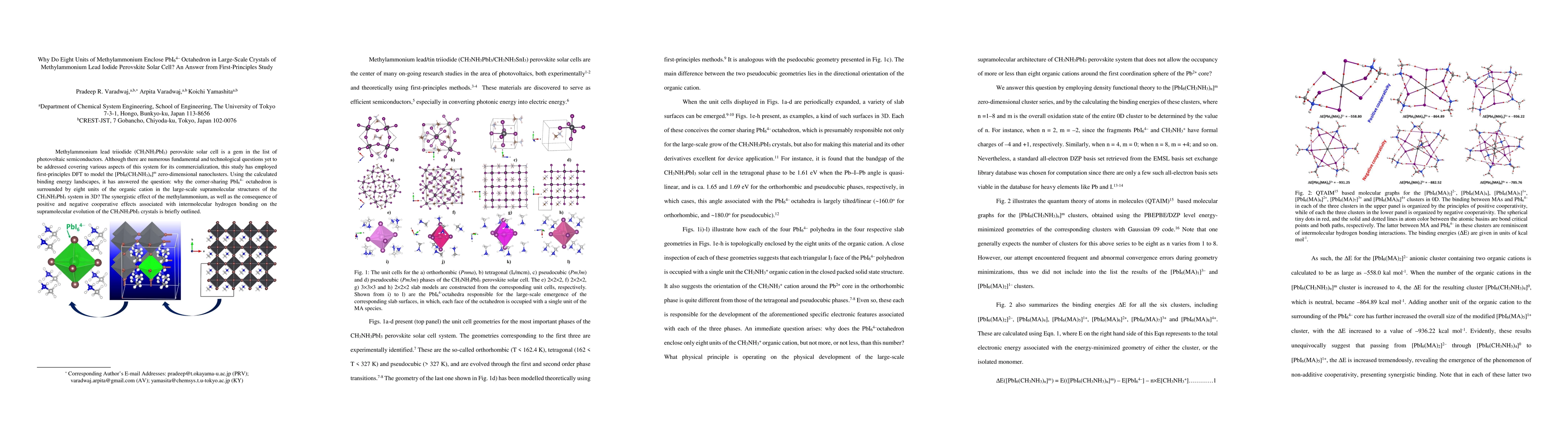 Methylammonium lead triiodide (CH3NH3PbI3) perovskite solar cell is a gem in the list of photovoltaic semiconductors. Although there are numerous fundamental and technological questions yet to be addressed covering various aspects of this system for its commercialization, this study has employed first-principles DFT to model the [PbI6(CH3NH3)n]m zero-dimensional nanoclusters. Using the calculated binding energy landscapes, it has answered the question: why the corner-sharing PbI6 octahedron is surrounded by eight units of the organic cation in the large-scale supramolecular structures of the CH3NH3PbI3 system in 3D? The synergistic effect of the methylammonium, as well as the consequence of positive and negative cooperative effects associated with intermolecular hydrogen bonding on the supramolecular evolution of the CH3NH3PbI3 crystals is briefly outlined.