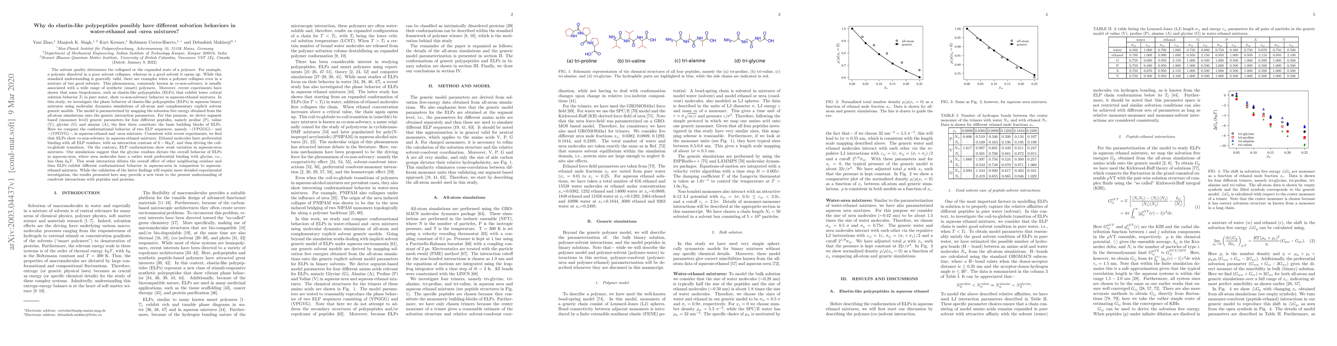 The solvent quality determines the collapsed or the expanded state of a polymer. For example, a polymer dissolved in a poor solvent collapses, whereas in a good solvent it opens up. While this standard understanding is generally valid, there are examples when a polymer collapses even in a mixture of two good solvents. This phenomenon, commonly known as co-non-solvency, is usually associated with smart polymers. Moreover, recent experiments have shown that the elastin-like polypeptides (ELPs) show co-non-solvency behavior in aqueous-ethanol mixtures. In this study, we investigate the phase behavior of ELPs in aqueous binary mixtures using molecular dynamics simulations of all-atom and complementary explicit solvent generic models. The model is parameterized by mapping the solvation free energy obtained from the all-atom simulations onto the generic interaction parameters. For this purpose, we derive segment based generic parameters for four different peptides, namely proline (P), valine (V), glycine (G) and alanine (A). Here we compare the conformational behavior of two ELP sequences, namely VPGGG and VPGVG, in aqueous-ethanol and -urea mixtures. Consistent with recent experiments, we find that ELPs show co-non-solvency in aqueous-ethanol mixtures. Ethanol molecules have preferential binding with all ELP residues and thus driving the coil-to-globule transition. On the contrary, ELP conformations show weak variation in aqueous-urea mixtures. Our simulations suggest that the glycine residues dictate the overall behavior of ELPs in aqueous-urea, where urea molecules have a rather weak preferential binding with glycine, i.e., less than kT. While the validation of the latter findings will require more detailed experimental investigation, the results presented here may provide a new twist to the present understanding of cosolvent interactions with peptides and proteins.