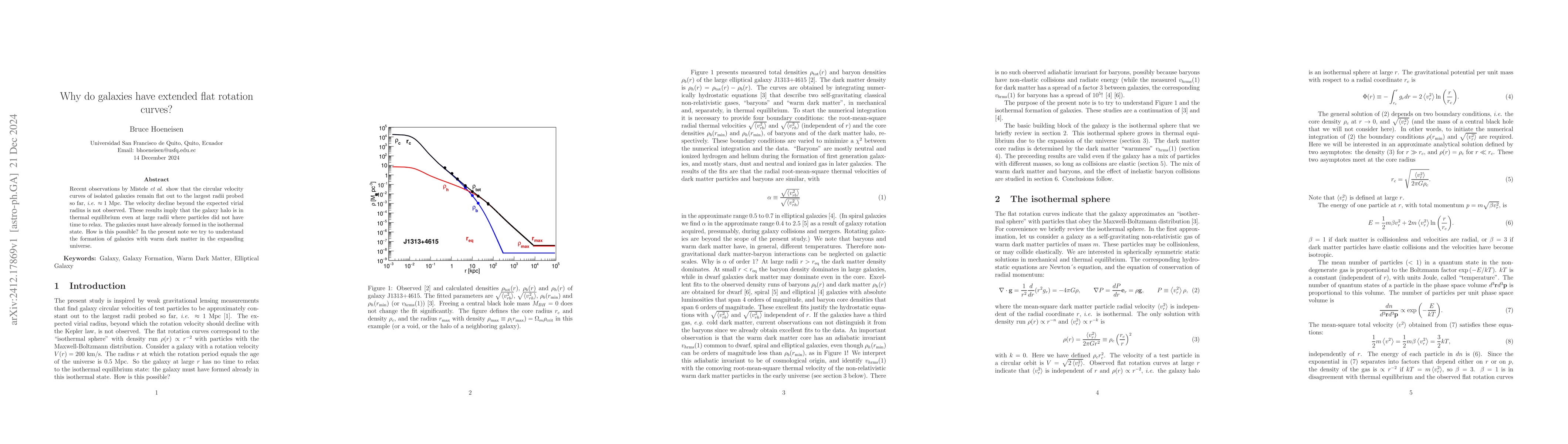 Summary: Mistele et al.'s observations reveal that galaxies exhibit flat rotation curves extending to 1 Mpc, indicating the presence of warm dark matter, which may explain the thermal equilibrium of galaxy halos even at large radii where particles haven't relaxed, suggesting an isothermal galaxy formation in an expanding universe.