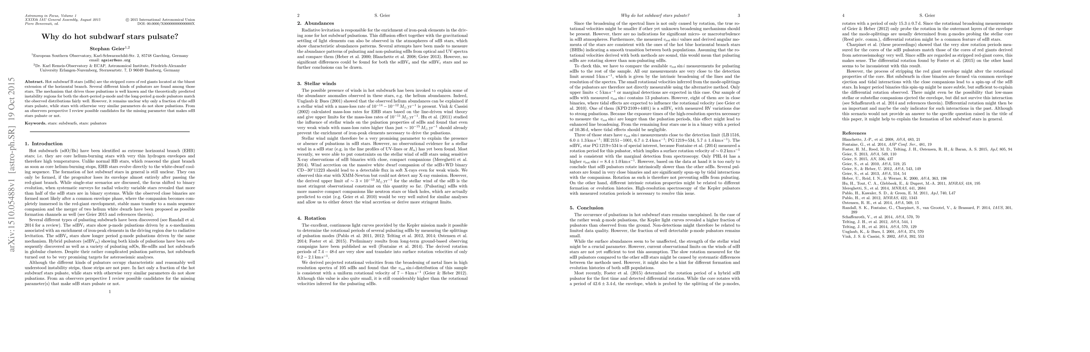 Hot subdwarf stars pulsate due to a combination of theoretical predictions and observed distributions, but the specific parameters required for pulsation remain unclear, leading to an ongoing search for missing factors.