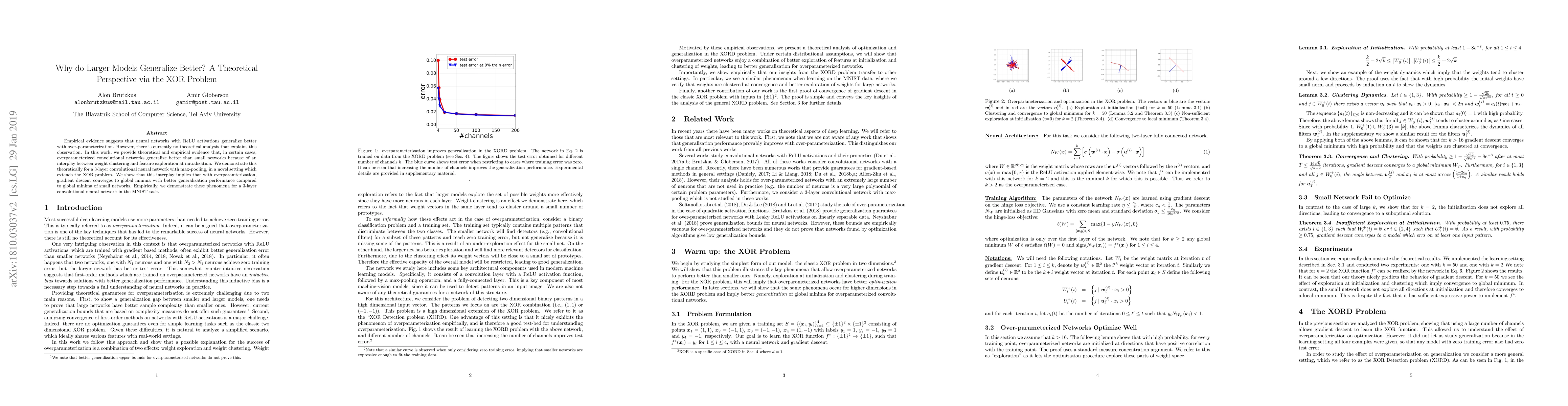 Empirical evidence suggests that neural networks with ReLU activations generalize better with over-parameterization. However, there is currently no theoretical analysis that explains this observation. In this work, we provide theoretical and empirical evidence that, in certain cases, overparameterized convolutional networks generalize better than small networks because of an interplay between weight clustering and feature exploration at initialization. We demonstrate this theoretically for a 3-layer convolutional neural network with max-pooling, in a novel setting which extends the XOR problem. We show that this interplay implies that with overparamterization, gradient descent converges to global minima with better generalization performance compared to global minima of small networks. Empirically, we demonstrate these phenomena for a 3-layer convolutional neural network in the MNIST task.