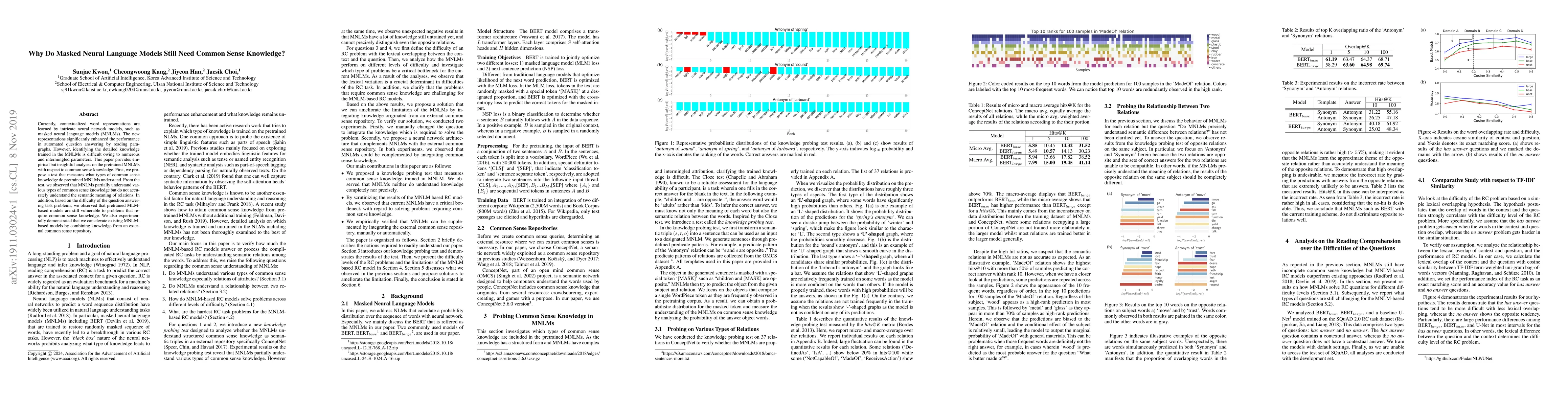 Currently, contextualized word representations are learned by intricate neural network models, such as masked neural language models (MNLMs). The new representations significantly enhanced the performance in automated question answering by reading paragraphs. However, identifying the detailed knowledge trained in the MNLMs is difficult owing to numerous and intermingled parameters. This paper provides empirical but insightful analyses on the pretrained MNLMs with respect to common sense knowledge. First, we propose a test that measures what types of common sense knowledge do pretrained MNLMs understand. From the test, we observed that MNLMs partially understand various types of common sense knowledge but do not accurately understand the semantic meaning of relations. In addition, based on the difficulty of the question-answering task problems, we observed that pretrained MLM-based models are still vulnerable to problems that require common sense knowledge. We also experimentally demonstrated that we can elevate existing MNLM-based models by combining knowledge from an external common sense repository.