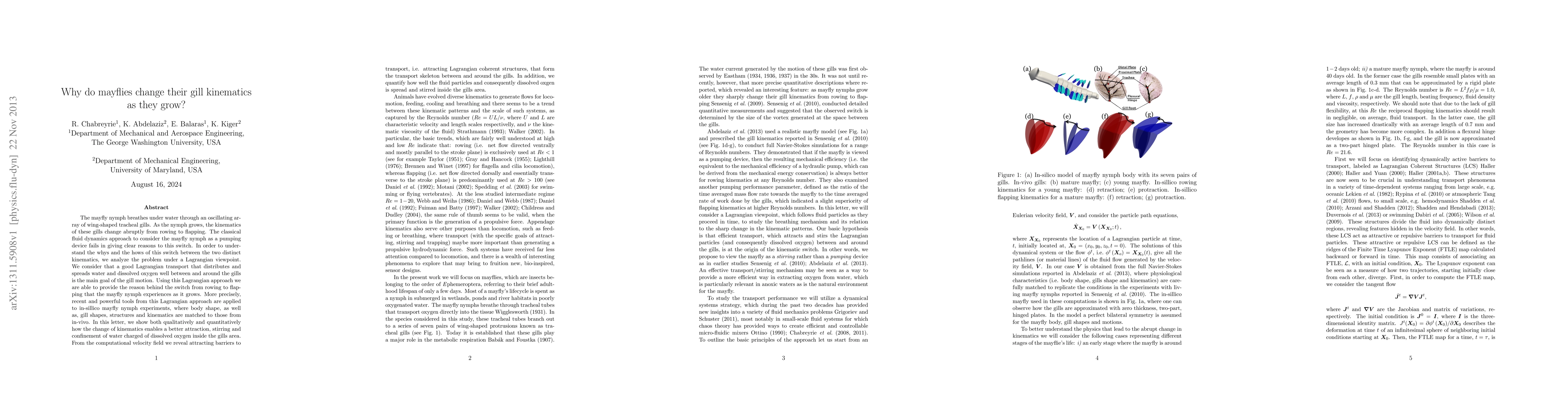 The mayfly nymph breathes under water through an oscillating array of wing-shaped tracheal gills. As the nymph grows, the kinematics of these gills change abruptly from rowing to flapping. The classical fluid dynamics approach to consider the mayfly nymph as a pumping device fails in giving clear reasons to this switch. In order to understand the whys and the hows of this switch between the two distinct kinematics, we analyze the problem under a Lagrangian viewpoint. We consider that a good Lagrangian transport that distributes and spreads water and dissolved oxygen well between and around the gills is the main goal of the gill motion. Using this Lagrangian approach we are able to provide the reason behind the switch from rowing to flapping that the mayfly nymph experiences as it grows. More precisely, recent and powerful tools from this Lagrangian approach are applied to in-sillico mayfly nymph experiments, where body shape, as well as, gill shapes, structures and kinematics are matched to those from in-vivo. In this letter, we show both qualitatively and quantitatively how the change of kinematics enables a better attraction, stirring and confinement of water charged of dissolved oxygen inside the gills area. From the computational velocity field we reveal attracting barriers to transport, i.e. attracting Lagrangian coherent structures, that form the transport skeleton between and around the gills. In addition, we quantify how well the fluid particles and consequently dissolved oxgen is spread and stirred inside the gills area.