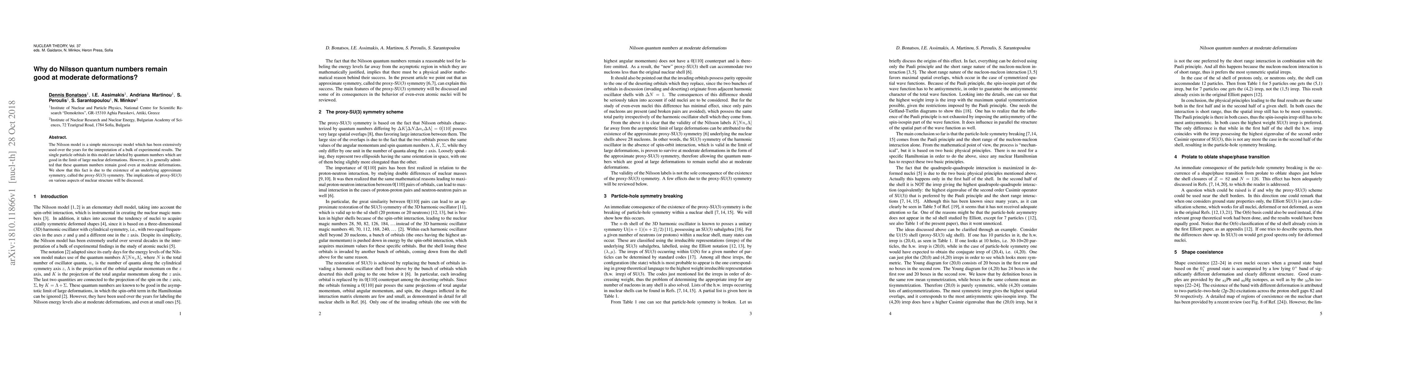 The Nilsson model is a simple microscopic model which has been extensively used over the years for the interpretation of a bulk of experimental results. The single particle orbitals in this model are labeled by quantum numbers which are good in the limit of large nuclear deformations. However, it is generally admitted that these quantum numbers remain good even at moderate deformations. We show that this fact is due to the existence of an underlying approximate symmetry, called the proxy-SU(3) symmetry. The implications of proxy-SU(3) on various aspects of nuclear structure will be discussed.