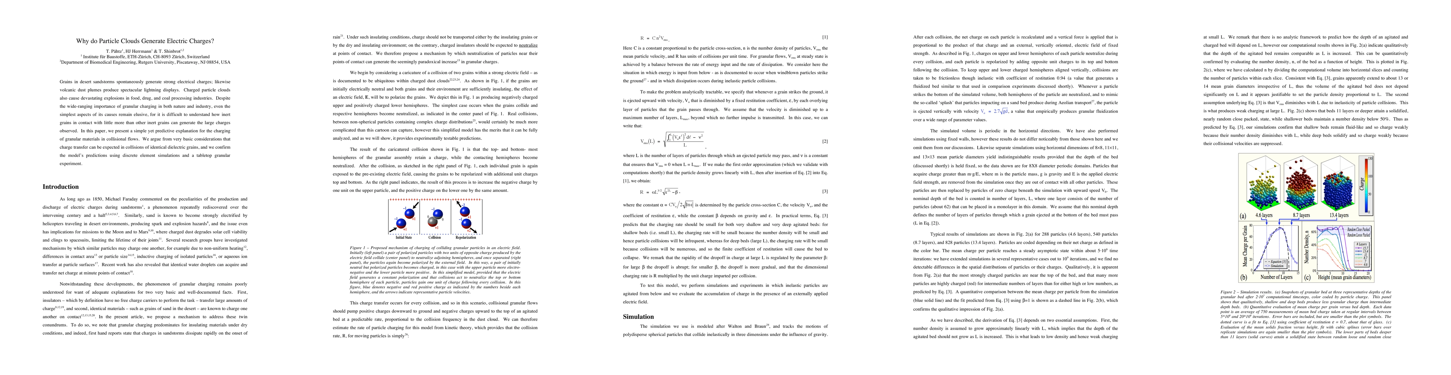 Grains in desert sandstorms spontaneously generate strong electrical charges; likewise volcanic dust plumes produce spectacular lightning displays. Charged particle clouds also cause devastating explosions in food, drug and coal processing industries. Despite the wide-ranging importance of granular charging in both nature and industry, even the simplest aspects of its causes remain elusive, because it is difficult to understand how inert grains in contact with little more than other inert grains can generate the large charges observed. Here, we present a simple yet predictive explanation for the charging of granular materials in collisional flows. We argue from very basic considerations that charge transfer can be expected in collisions of identical dielectric grains in the presence of an electric field, and we confirm the model's predictions using discrete-element simulations and a tabletop granular experiment.