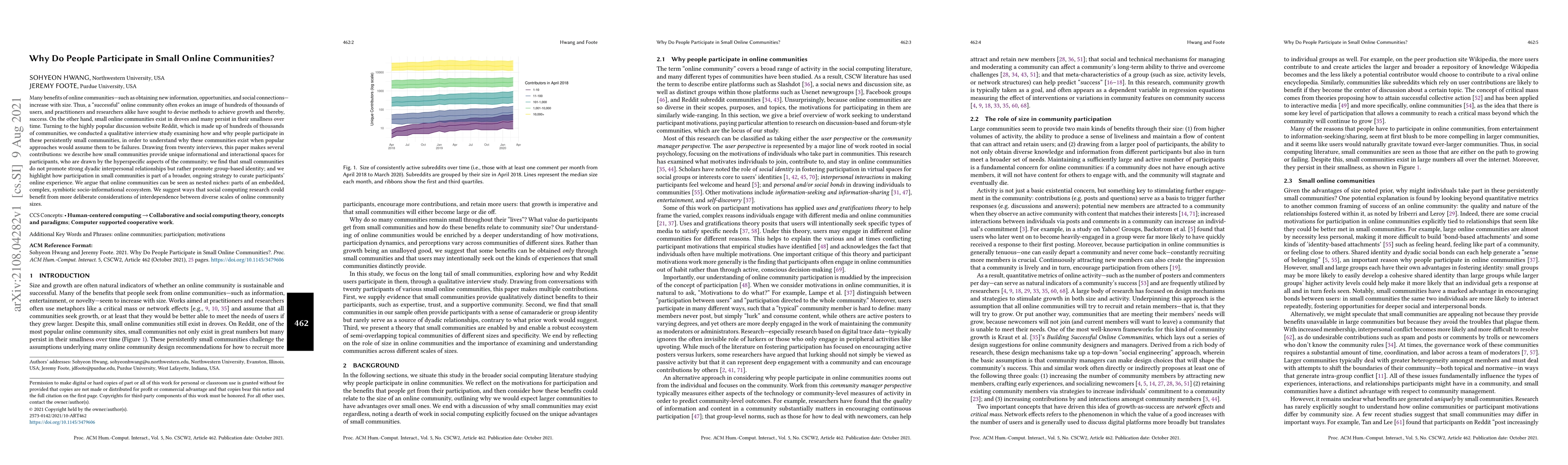 This study explores why individuals participate in small, persistently small online communities on Reddit, finding that they offer unique, hyperspecific informational and interactional spaces, foster group-based identity rather than strong interpersonal relationships, and fit into a broader strategy of curating participants' online experiences. The research suggests a reevaluation of how online communities are viewed, proposing they exist as nested niches within a complex socio-informational ecosystem.