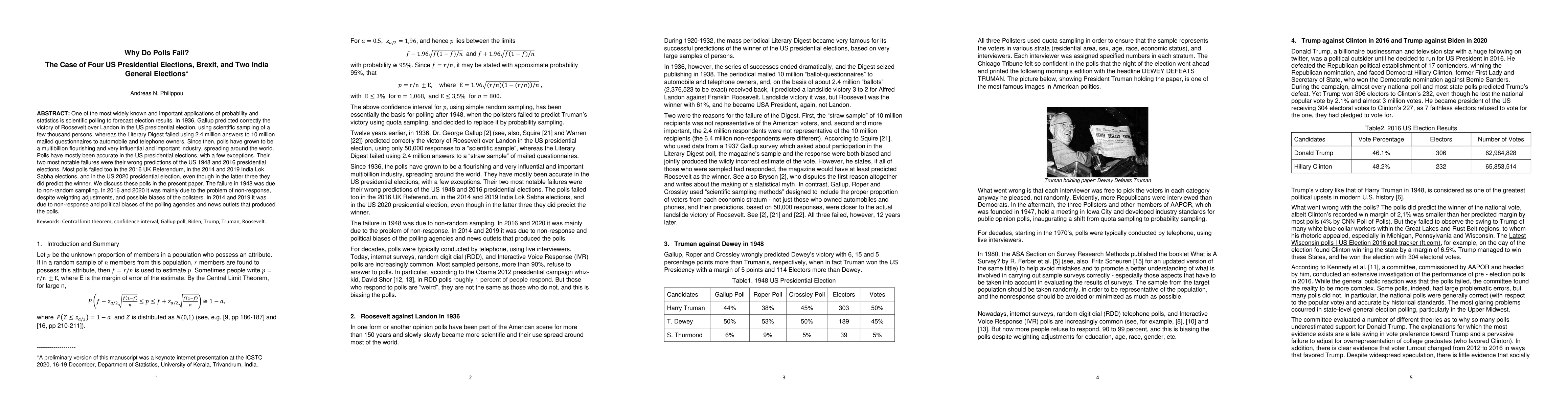 This paper examines the failures of scientific polling in predicting outcomes for four US presidential elections, Brexit, and two Indian general elections, attributing inaccuracies primarily to non-random sampling, non-response bias, and political biases in polling agencies.