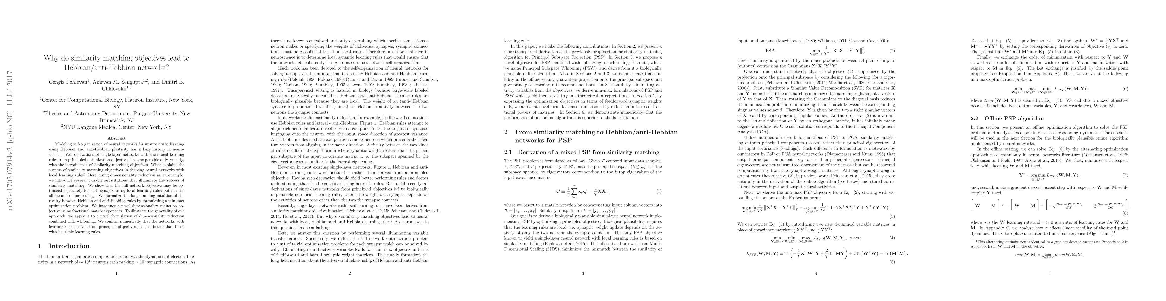 This paper explores why similarity matching objectives lead to Hebbian/anti-Hebbian networks by introducing variable substitutions that reveal how these objectives can be optimized locally. It formalizes the rivalry between Hebbian and anti-Hebbian rules through a min-max optimization problem and demonstrates the effectiveness of derived learning rules in dimensionality reduction tasks.