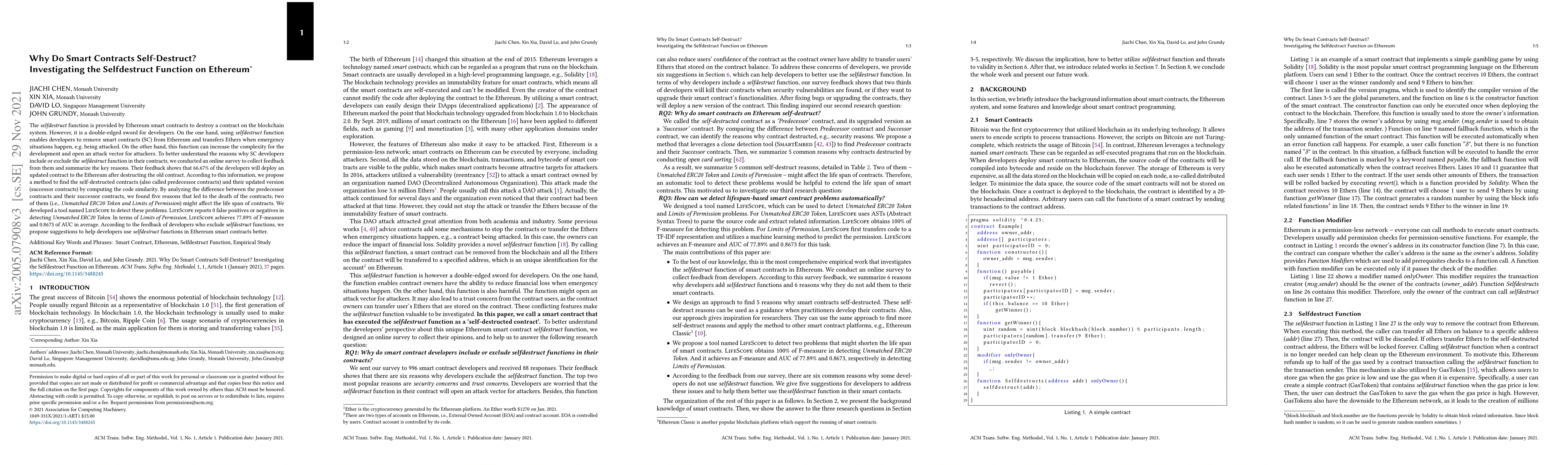 This paper investigates the selfdestruct function in Ethereum smart contracts, revealing its dual role in contract removal and potential complexity. An online survey found that 66.67% of developers replace old contracts with new ones after selfdestruct. The authors propose a method to identify predecessor and successor contracts using code similarity and developed a tool, LifeScope, to detect issues like Unmatched ERC20 Token and Limits of Permission, providing suggestions to improve developers' use of selfdestruct functions.