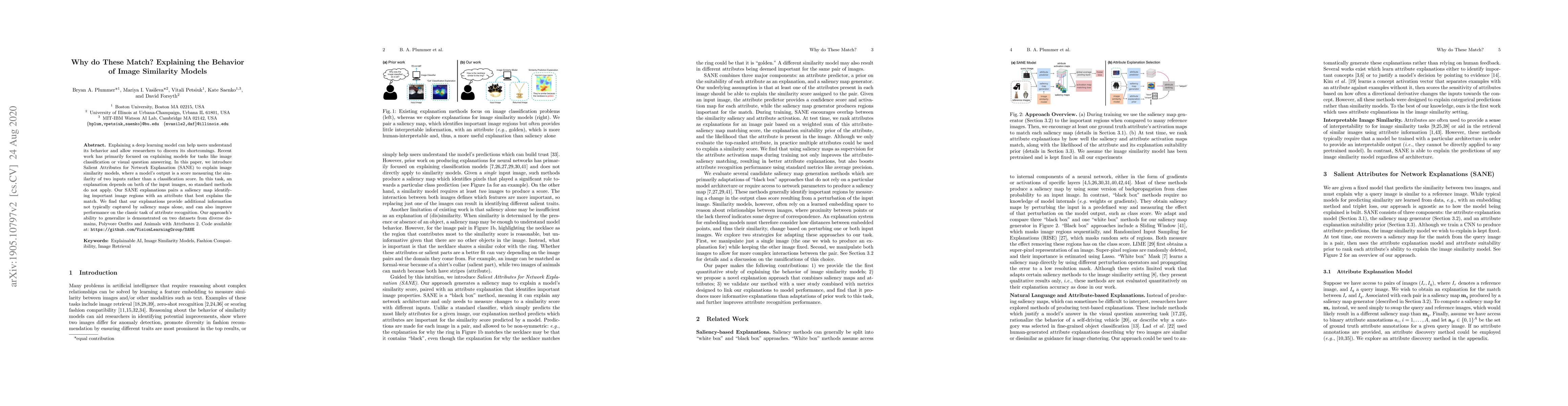 Explaining a deep learning model can help users understand its behavior and allow researchers to discern its shortcomings. Recent work has primarily focused on explaining models for tasks like image classification or visual question answering. In this paper, we introduce Salient Attributes for Network Explanation (SANE) to explain image similarity models, where a model's output is a score measuring the similarity of two inputs rather than a classification score. In this task, an explanation depends on both of the input images, so standard methods do not apply. Our SANE explanations pairs a saliency map identifying important image regions with an attribute that best explains the match. We find that our explanations provide additional information not typically captured by saliency maps alone, and can also improve performance on the classic task of attribute recognition. Our approach's ability to generalize is demonstrated on two datasets from diverse domains, Polyvore Outfits and Animals with Attributes 2. Code available at: https://github.com/VisionLearningGroup/SANE