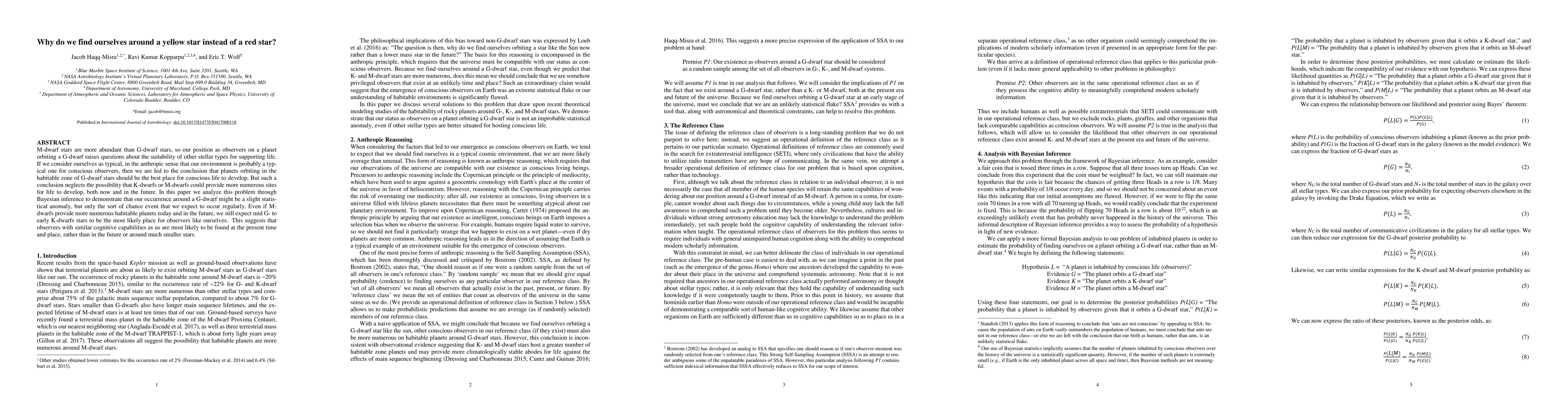 M-dwarf stars are more abundant than G-dwarf stars, so our position as observers on a planet orbiting a G-dwarf raises questions about the suitability of other stellar types for supporting life. If we consider ourselves as typical, in the anthropic sense that our environment is probably a typical one for conscious observers, then we are led to the conclusion that planets orbiting in the habitable zone of G-dwarf stars should be the best place for conscious life to develop. But such a conclusion neglects the possibility that K-dwarfs or M-dwarfs could provide more numerous sites for life to develop, both now and in the future. In this paper we analyze this problem through Bayesian inference to demonstrate that our occurrence around a G-dwarf might be a slight statistical anomaly, but only the sort of chance event that we expect to occur regularly. Even if M-dwarfs provide more numerous habitable planets today and in the future, we still expect mid G- to early K-dwarfs stars to be the most likely place for observers like ourselves. This suggests that observers with similar cognitive capabilities as us are most likely to be found at the present time and place, rather than in the future or around much smaller stars.