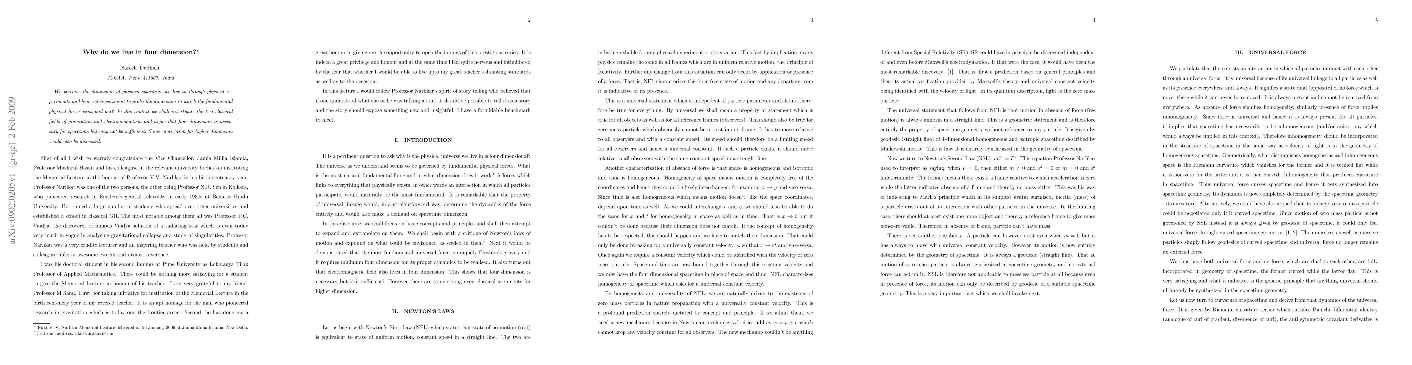 This paper explores the necessity of four-dimensional spacetime for fundamental physical forces like gravitation and electromagnetism, while also considering the possibility of higher dimensions. It argues that while four dimensions are essential, they may not be sufficient, prompting a discussion on potential higher-dimensional theories.