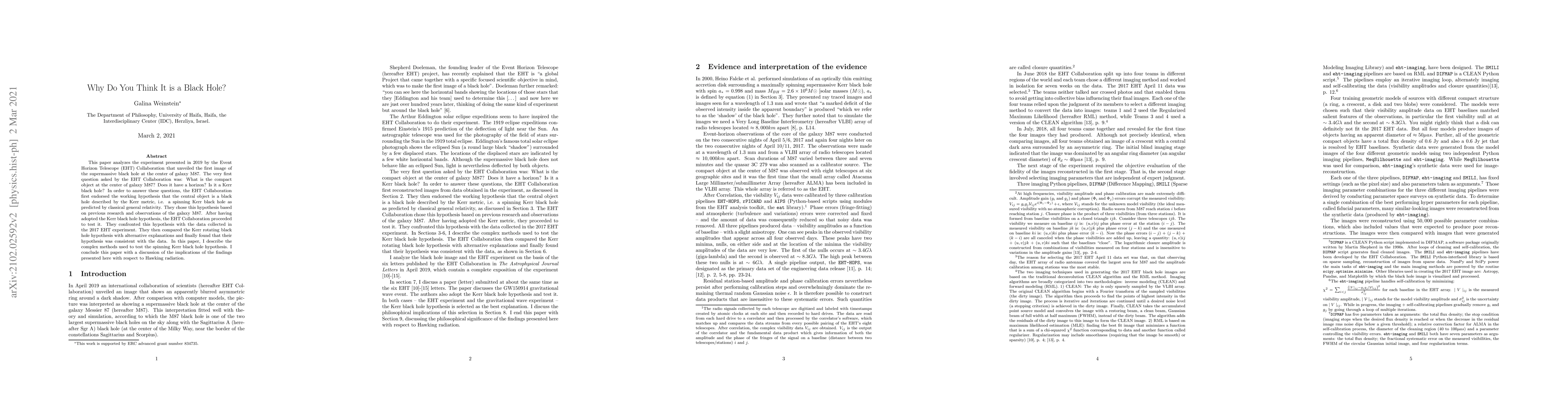 This paper analyzes the experiment presented in 2019 by the Event Horizon Telescope (EHT) Collaboration that unveiled the first image of the supermassive black hole at the center of galaxy M87. The very first question asked by the EHT Collaboration was: What is the compact object at the center of galaxy M87? Does it have a horizon? Is it a Kerr black hole? In order to answer these questions, the EHT Collaboration first endorsed the working hypothesis that the central object is a black hole described by the Kerr metric, i.e. a spinning Kerr black hole as predicted by classical general relativity. They chose this hypothesis based on previous research and observations of the galaxy M87. After having adopted the Kerr black hole hypothesis, the EHT Collaboration proceeded to test it. They confronted this hypothesis with the data collected in the 2017 EHT experiment. They then compared the Kerr rotating black hole hypothesis with alternative explanations and finally found that their hypothesis was consistent with the data. In this paper, I describe the complex methods used to test the spinning Kerr black hole hypothesis. I conclude this paper with a discussion of the implications of the findings presented here with respect to Hawking radiation.