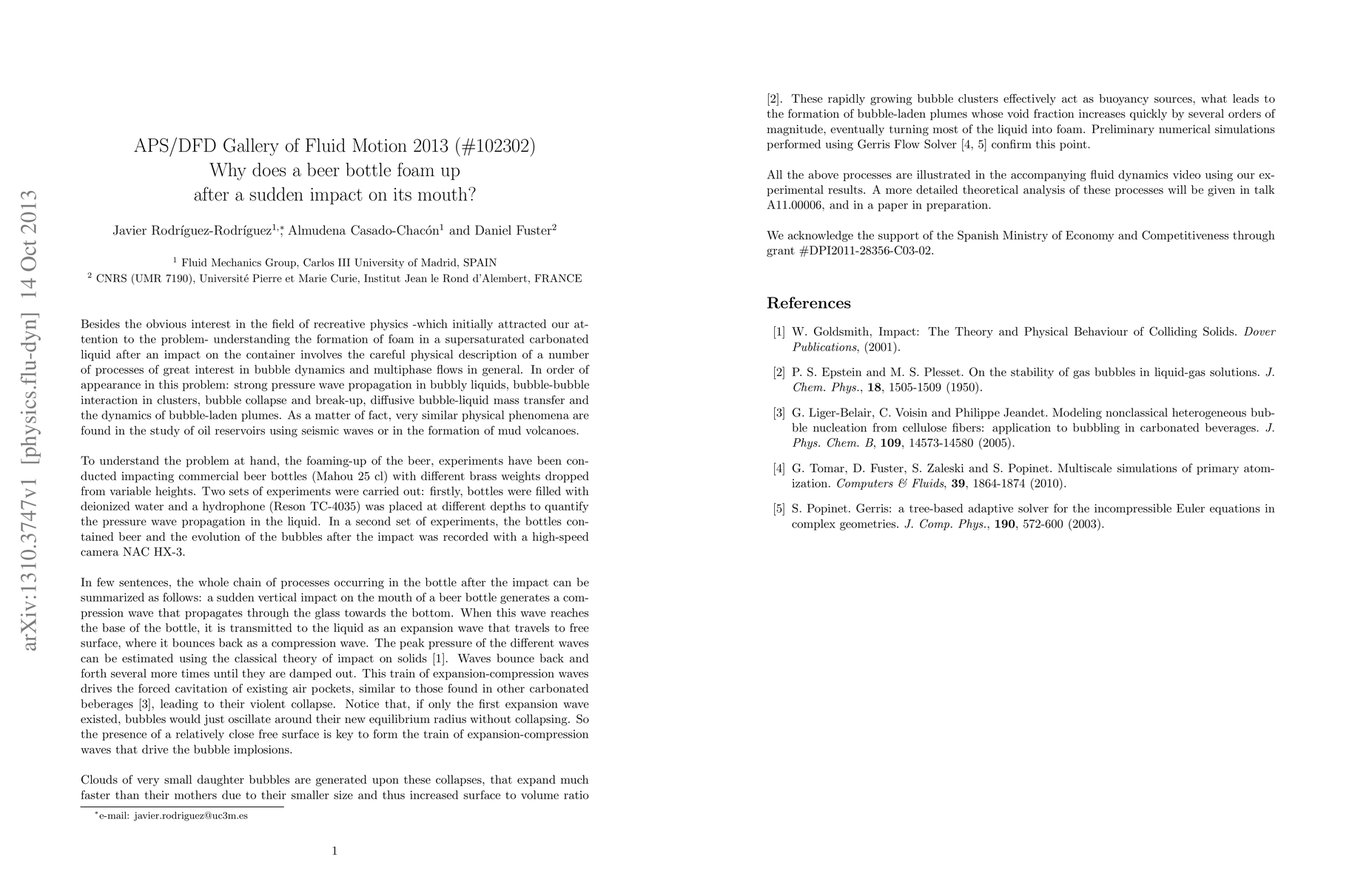 A sudden impact on a beer bottle generates compression and expansion waves that propagate through the glass and liquid, causing the violent collapse of air pockets and rapid formation of foam. The small daughter bubbles created expand quickly, leading to a significant increase in foam volume.