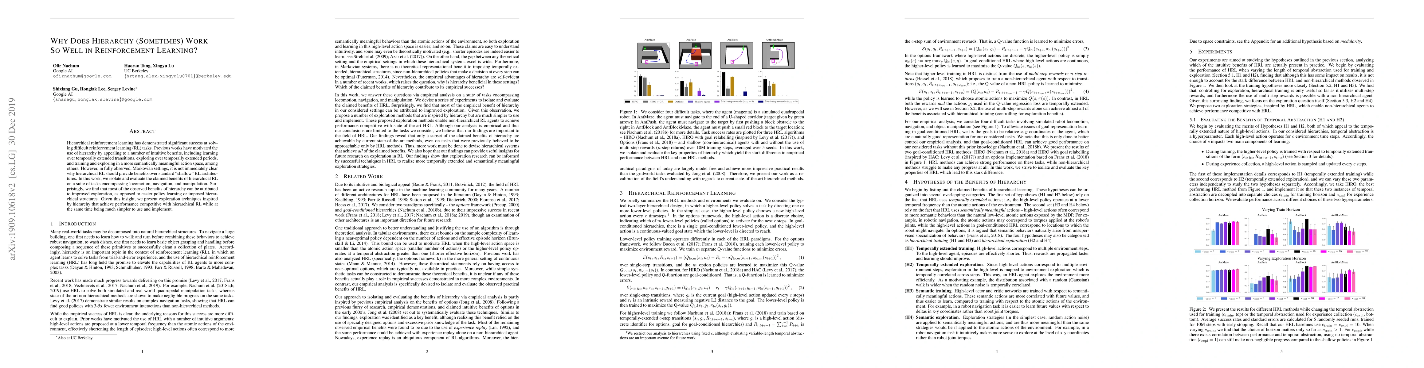 This paper investigates why hierarchical reinforcement learning (RL) often outperforms standard RL in complex tasks, finding that its benefits primarily stem from enhanced exploration rather than inherent structural advantages. It proposes simpler exploration techniques that match the performance of hierarchical RL.