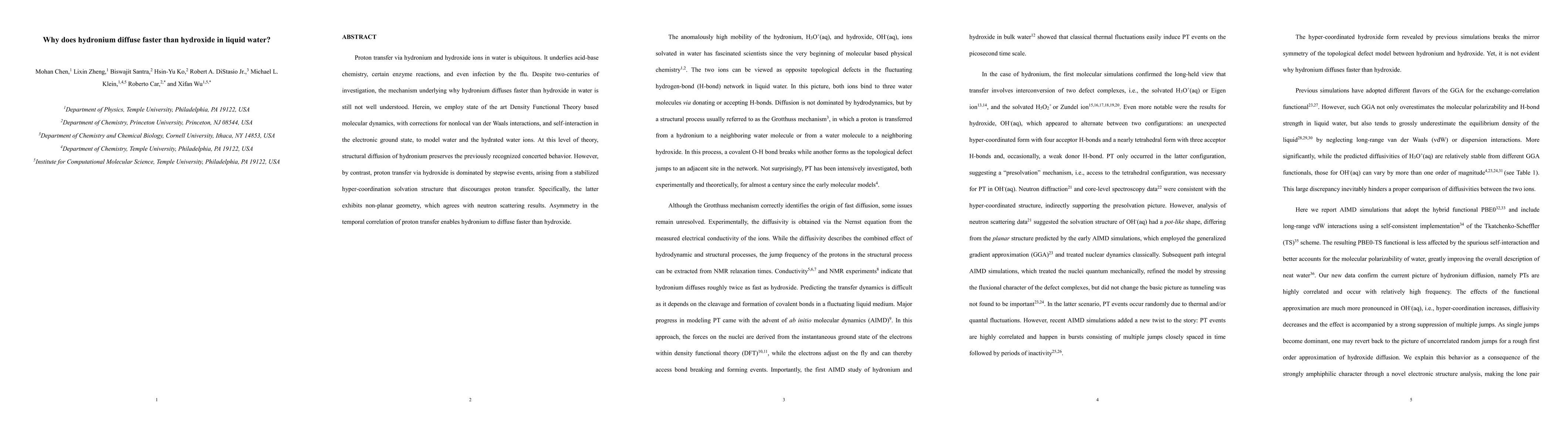 This paper uses advanced computational methods to determine that hydronium diffuses faster than hydroxide in water due to its concerted structural diffusion and stepwise proton transfer via hydroxide, which is hindered by a stabilized, non-planar solvation structure.