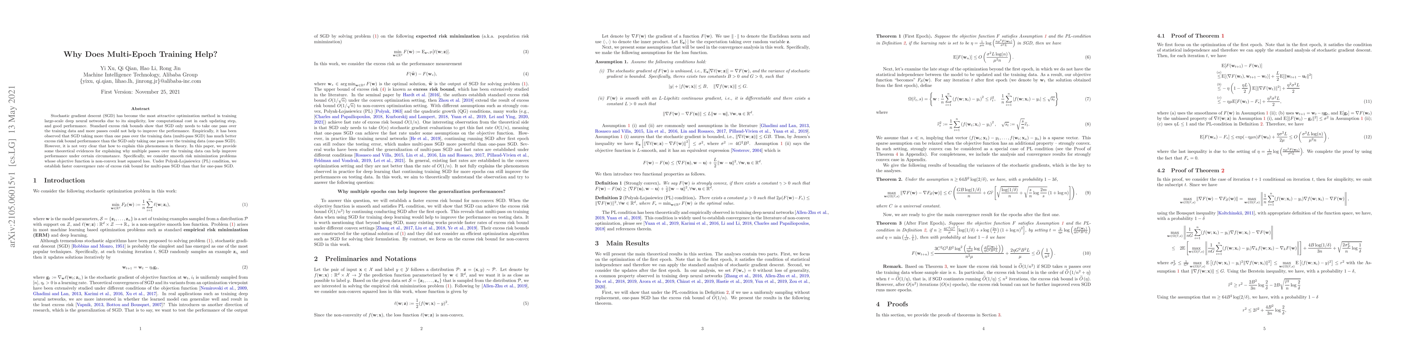 This paper investigates why multi-epoch training with stochastic gradient descent (SGD) can improve performance despite theoretical expectations. It provides theoretical evidence showing that multi-pass SGD can achieve faster convergence rates under the Polyak-Lojasiewicz condition, explaining the empirical observation of better performance with multiple training passes.