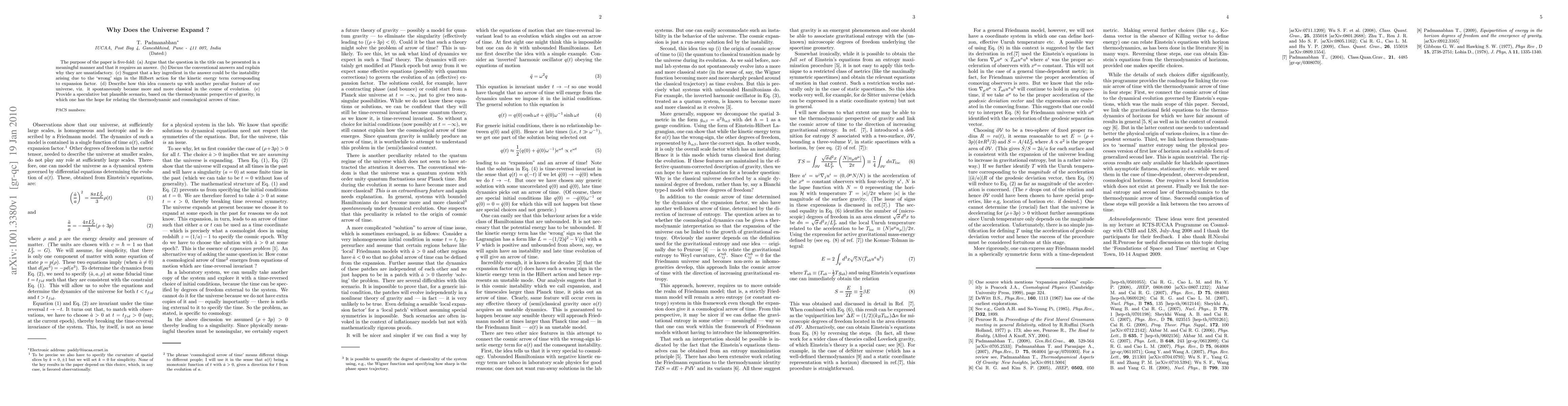 The purpose of the paper is five-fold: (a) Argue that the question in the title can be presented in a meaningful manner and that it requires an answer. (b) Discuss the conventional answers and explain why they are unsatisfactory. (c) Suggest that a key ingredient in the answer could be the instability arising due to the `wrong' sign in the Hilbert action for the kinetic energy term corresponding to expansion factor. (d) Describe how this idea connects up with another peculiar feature of our universe, viz. it spontaneously became more and more classical in the course of evolution. (e) Provide a speculative but plausible scenario, based on the thermodynamic perspective of gravity, in which one has the hope for relating the thermodynamic and cosmological arrows of time.