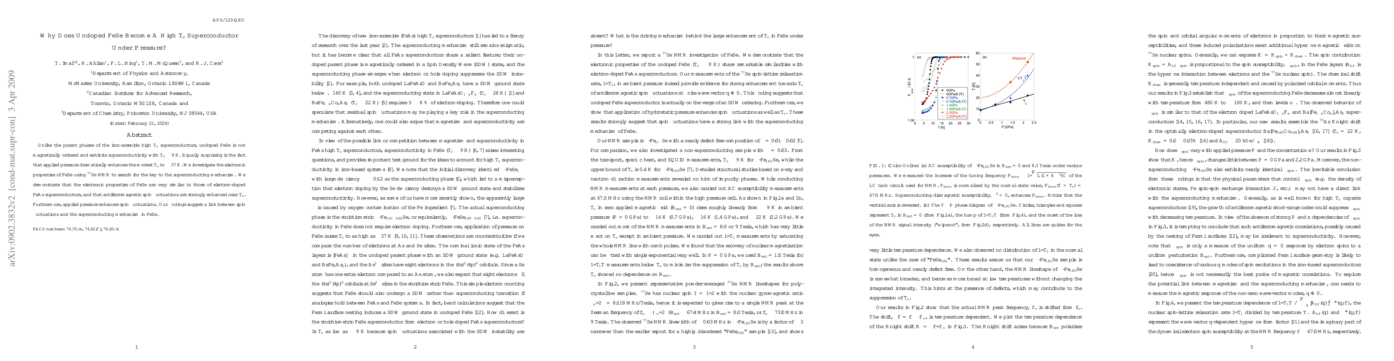 The study reveals that undoped FeSe exhibits superconductivity with Tc~9K and its critical temperature dramatically rises to ~37K under pressure. Using 77Se NMR, the research indicates that FeSe's electronic properties resemble those of electron-doped FeAs superconductors, with significant enhancement of antiferromagnetic spin fluctuations near Tc, suggesting a connection between spin fluctuations and superconductivity.