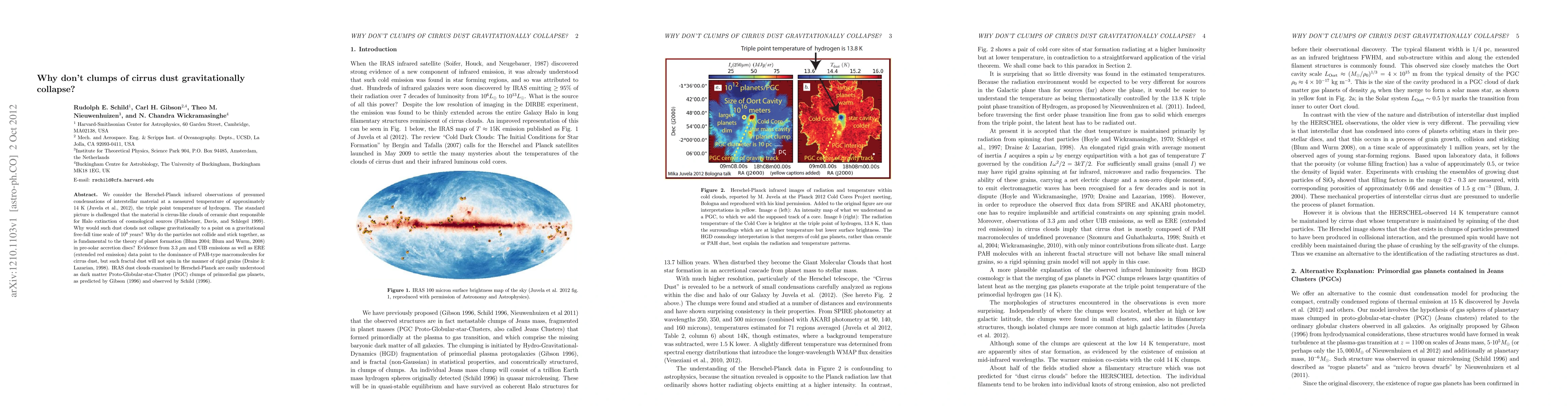 We consider the Herschel-Planck infrared observations of presumed condensations of interstellar material at a measured temperature of approximately 14 K (Juvela et al., 2012), the triple point temperature of hydrogen. The standard picture is challenged that the material is cirrus-like clouds of ceramic dust responsible for Halo extinction of cosmological sources (Finkbeiner, Davis, and Schlegel 1999). Why would such dust clouds not collapse gravitationally to a point on a gravitational free-fall time scale of $10^8$ years? Why do the particles not collide and stick together, as is fundamental to the theory of planet formation (Blum 2004; Blum and Wurm, 2008) in pre-solar accretion discs? Evidence from 3.3 $\mu$m and UIB emissions as well as ERE (extended red emission) data point to the dominance of PAH-type macromolecules for cirrus dust, but such fractal dust will not spin in the manner of rigid grains (Draine & Lazarian, 1998). IRAS dust clouds examined by Herschel-Planck are easily understood as dark matter Proto-Globular-star-Cluster (PGC) clumps of primordial gas planets, as predicted by Gibson (1996) and observed by Schild (1996).