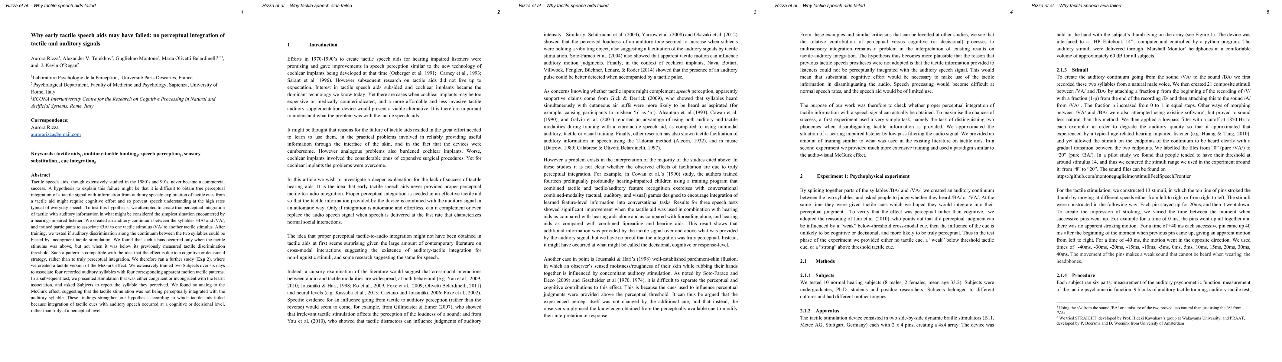 The study reveals that tactile speech aids failed commercially because they did not achieve true perceptual integration of tactile and auditory signals, relying instead on cognitive processing. Experiments showed no evidence of perceptual integration, such as the McGurk effect, suggesting that tactile cues were processed at a decisional rather than a perceptual level.