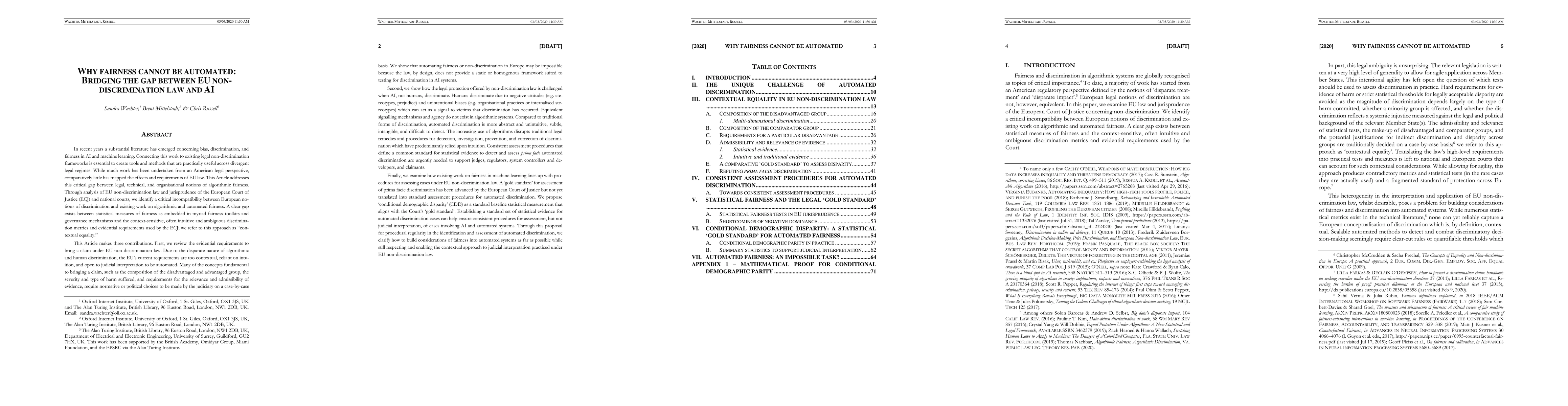 This article identifies a critical incompatibility between European notions of discrimination and existing statistical measures of fairness. First, we review the evidential requirements to bring a claim under EU non-discrimination law. Due to the disparate nature of algorithmic and human discrimination, the EU's current requirements are too contextual, reliant on intuition, and open to judicial interpretation to be automated. Second, we show how the legal protection offered by non-discrimination law is challenged when AI, not humans, discriminate. Humans discriminate due to negative attitudes (e.g. stereotypes, prejudice) and unintentional biases (e.g. organisational practices or internalised stereotypes) which can act as a signal to victims that discrimination has occurred. Finally, we examine how existing work on fairness in machine learning lines up with procedures for assessing cases under EU non-discrimination law. We propose "conditional demographic disparity" (CDD) as a standard baseline statistical measurement that aligns with the European Court of Justice's "gold standard." Establishing a standard set of statistical evidence for automated discrimination cases can help ensure consistent procedures for assessment, but not judicial interpretation, of cases involving AI and automated systems. Through this proposal for procedural regularity in the identification and assessment of automated discrimination, we clarify how to build considerations of fairness into automated systems as far as possible while still respecting and enabling the contextual approach to judicial interpretation practiced under EU non-discrimination law. N.B. Abridged abstract