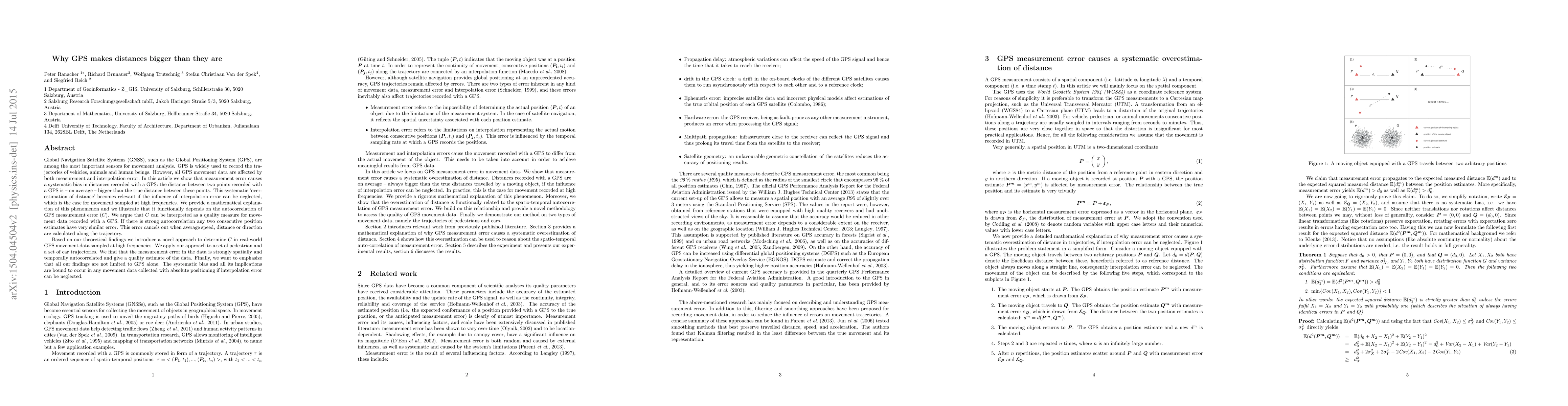 GPS measurement error causes systematic overestimation of distance in GPS data, especially when high-frequency sampling is used, and this effect can be quantified using a quality measure called autocorrelation (C).