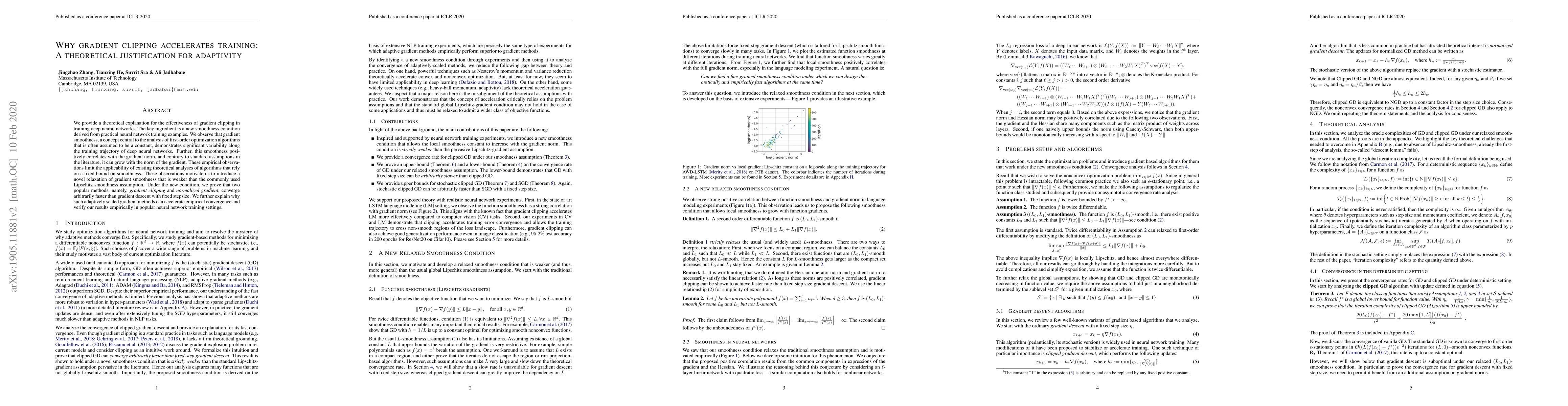 We provide a theoretical explanation for the effectiveness of gradient clipping in training deep neural networks. The key ingredient is a new smoothness condition derived from practical neural network training examples. We observe that gradient smoothness, a concept central to the analysis of first-order optimization algorithms that is often assumed to be a constant, demonstrates significant variability along the training trajectory of deep neural networks. Further, this smoothness positively correlates with the gradient norm, and contrary to standard assumptions in the literature, it can grow with the norm of the gradient. These empirical observations limit the applicability of existing theoretical analyses of algorithms that rely on a fixed bound on smoothness. These observations motivate us to introduce a novel relaxation of gradient smoothness that is weaker than the commonly used Lipschitz smoothness assumption. Under the new condition, we prove that two popular methods, namely, \emph{gradient clipping} and \emph{normalized gradient}, converge arbitrarily faster than gradient descent with fixed stepsize. We further explain why such adaptively scaled gradient methods can accelerate empirical convergence and verify our results empirically in popular neural network training settings.