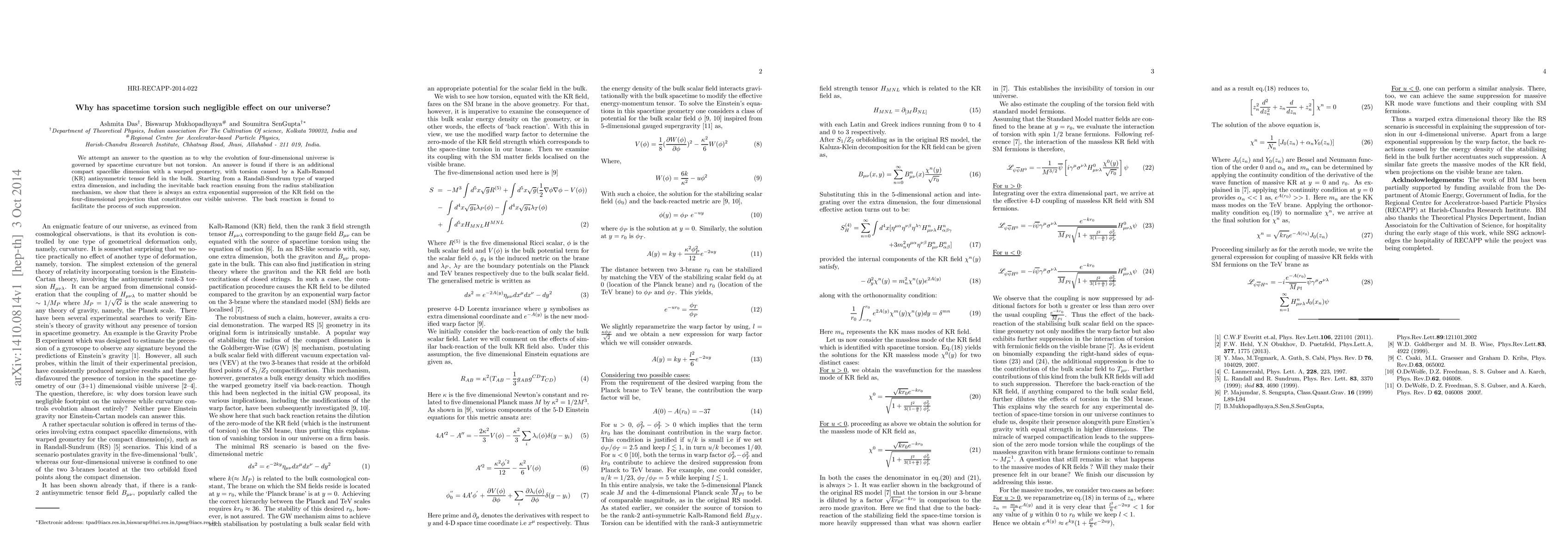 The paper explores why spacetime torsion has negligible effects in our universe, proposing that a compact spacelike extra dimension with a warped geometry and a Kalb-Ramond field in the bulk leads to an exponential suppression of torsion, facilitated by the back reaction from the stabilization mechanism of the extra dimension.