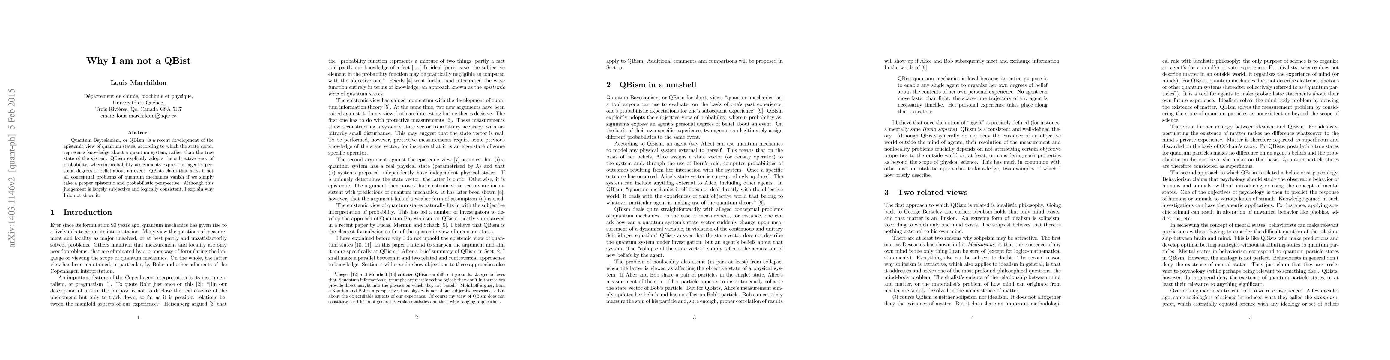 Quantum Bayesianism, or QBism, is a recent development of the epistemic view of quantum states, according to which the state vector represents knowledge about a quantum system, rather than the true state of the system. QBism explicitly adopts the subjective view of probability, wherein probability assignments express an agent's personal degrees of belief about an event. QBists claim that most if not all conceptual problems of quantum mechanics vanish if we simply take a proper epistemic and probabilistic perspective. Although this judgement is largely subjective and logically consistent, I explain why I do not share it.