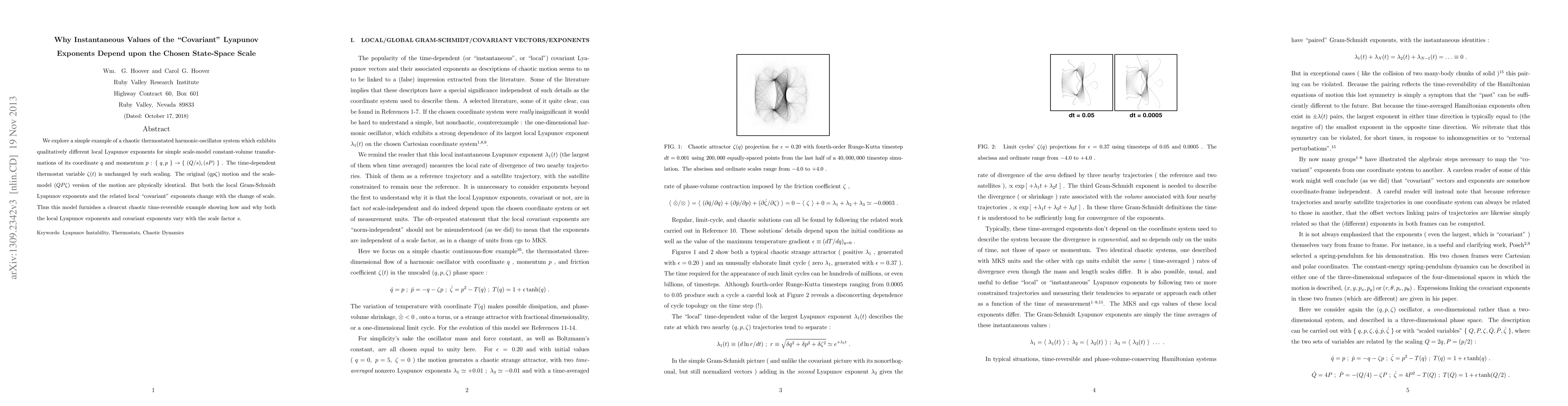We explore a simple example of a chaotic thermostated harmonic-oscillator system which exhibits qualitatively different local Lyapunov exponents for simple scale-model constant-volume transformations of its coordinate q and momentum p : { q,p } --> { (Q/s),(sP) } . The time-dependent thermostat variable zeta(t) is unchanged by such scaling. The original (q,p,zeta) motion and the scale-model (Q,P,zeta) version of the motion are physically identical. But both the local Gram-Schmidt Lyapunov exponents and the related local "covariant" exponents change with the change of scale. Thus this model furnishes a clearcut chaotic time-reversible example showing how and why both the local Lyapunov exponents and covariant exponents vary with the scale factor s .