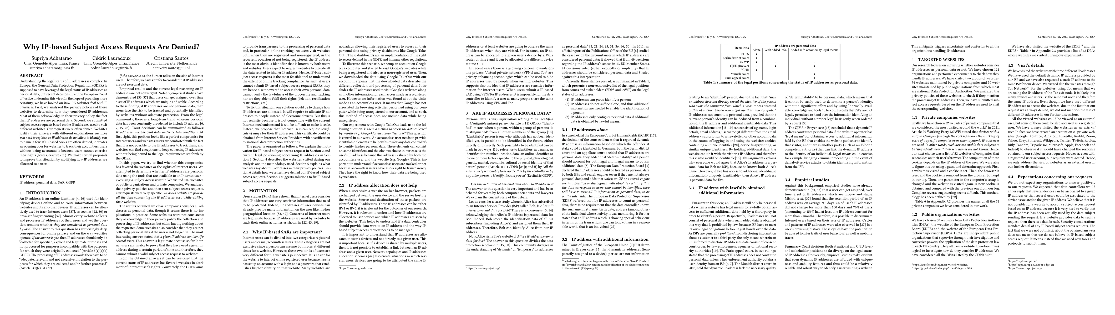 This paper examines the denial of IP-based subject access requests under GDPR, finding that despite IP addresses being recognized as personal data, many websites deny such requests citing various justifications. The study proposes improvements to better align IP address management with data protection laws.