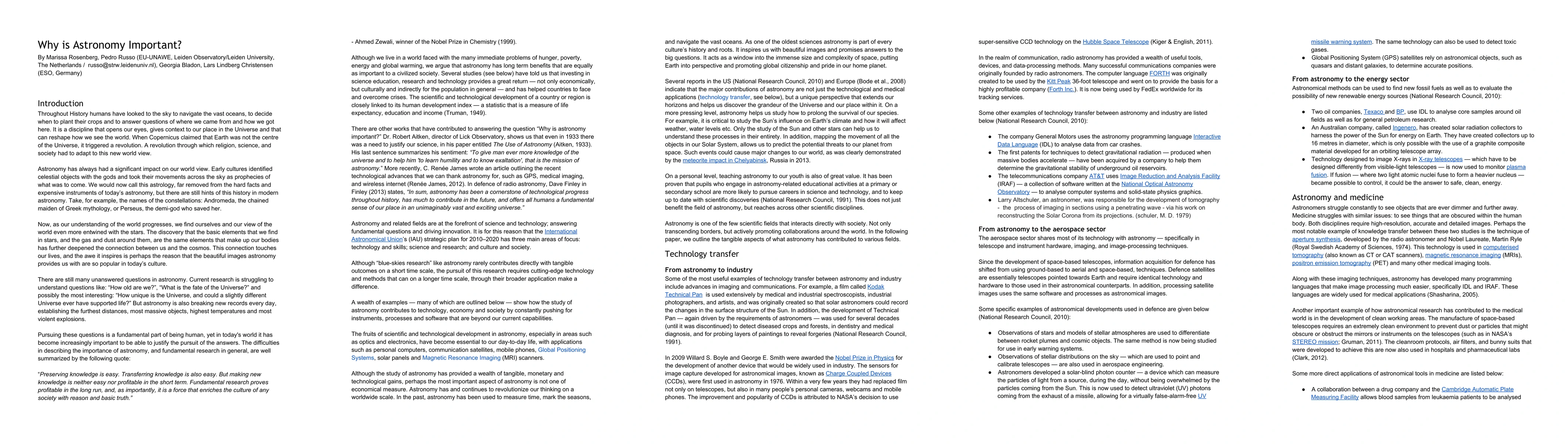 Astronomy and related fields are at the forefront of science and technology; answering fundamental questions and driving innovation. Although blue-skies research like astronomy rarely contributes directly with tangible outcomes on a short time scale, the pursuit of this research requires cutting-edge technology and methods that can on a longer time scale, through their broader application make a difference. A wealth of examples show how the study of astronomy contributes to technology, economy and society by constantly pushing for instruments, processes and software that are beyond our current capabilities. In this essay we outline both the tangible and intangible reasons that astronomy is an important part of society. Although we have focused mainly on the technology and knowledge transfer, perhaps the most important contribution is still the fact that astronomy makes us aware of how we fit into the vast Universe.