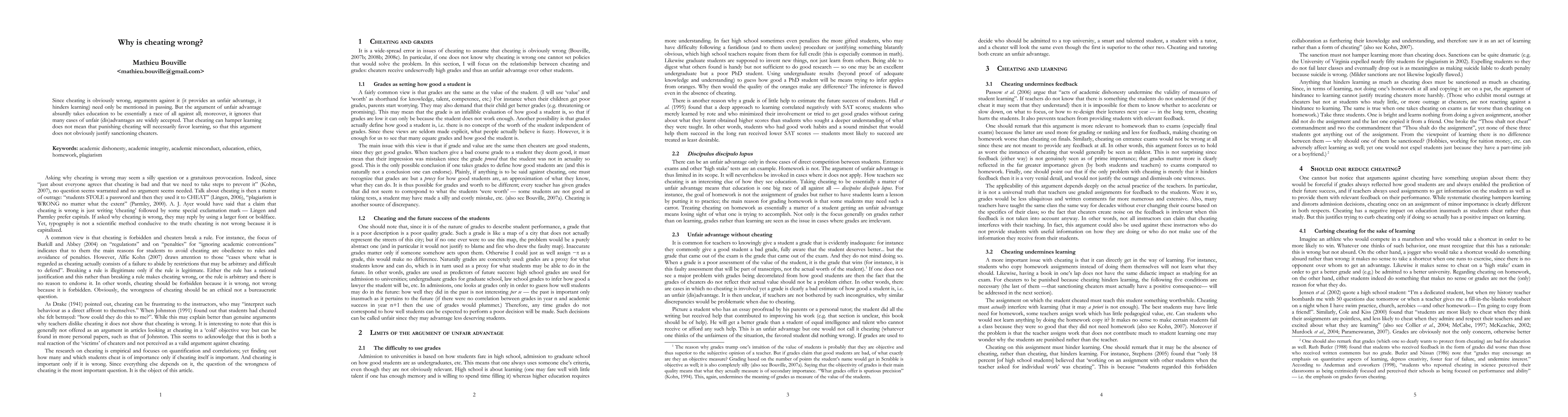Since cheating is obviously wrong, arguments against it (it provides an unfair advantage, it hinders learning) need only be mentioned in passing. But the argument of unfair advantage absurdly takes education to be essentially a race of all against all; moreover, it ignores that many cases of unfair (dis)advantages are widely accepted. That cheating can hamper learning does not mean that punishing cheating will necessarily favor learning, so that this argument does not obviously justify sanctioning cheaters. -- Keywords: academic dishonesty, academic integrity, academic misconduct, education, ethics, homework, plagiarism