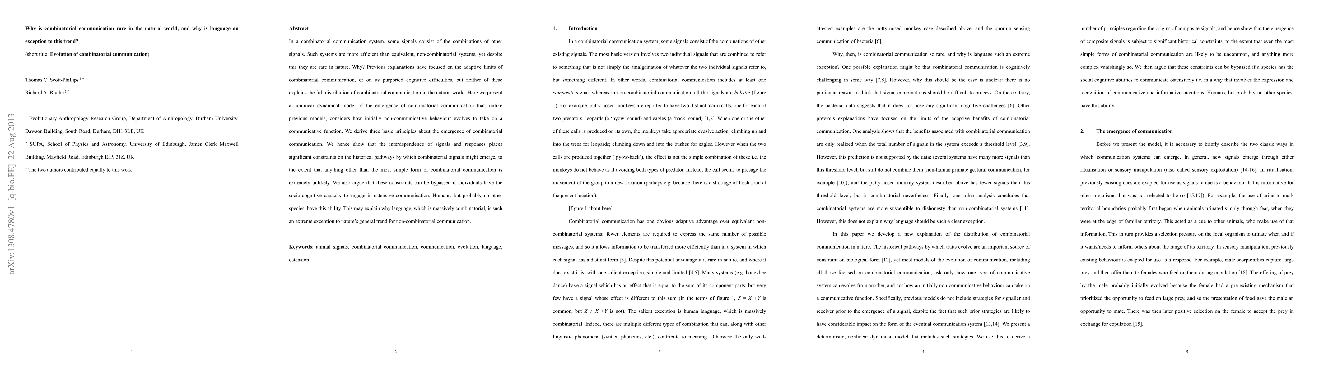 In a combinatorial communication system, some signals consist of the combinations of other signals. Such systems are more efficient than equivalent, non-combinatorial systems, yet despite this they are rare in nature. Why? Previous explanations have focused on the adaptive limits of combinatorial communication, or on its purported cognitive difficulties, but neither of these explains the full distribution of combinatorial communication in the natural world. Here we present a nonlinear dynamical model of the emergence of combinatorial communication that, unlike previous models, considers how initially non-communicative behaviour evolves to take on a communicative function. We derive three basic principles about the emergence of combinatorial communication. We hence show that the interdependence of signals and responses places significant constraints on the historical pathways by which combinatorial signals might emerge, to the extent that anything other than the most simple form of combinatorial communication is extremely unlikely. We also argue that these constraints can be bypassed if individuals have the socio-cognitive capacity to engage in ostensive communication. Humans, but probably no other species, have this ability. This may explain why language, which is massively combinatorial, is such an extreme exception to nature's general trend for non-combinatorial communication.