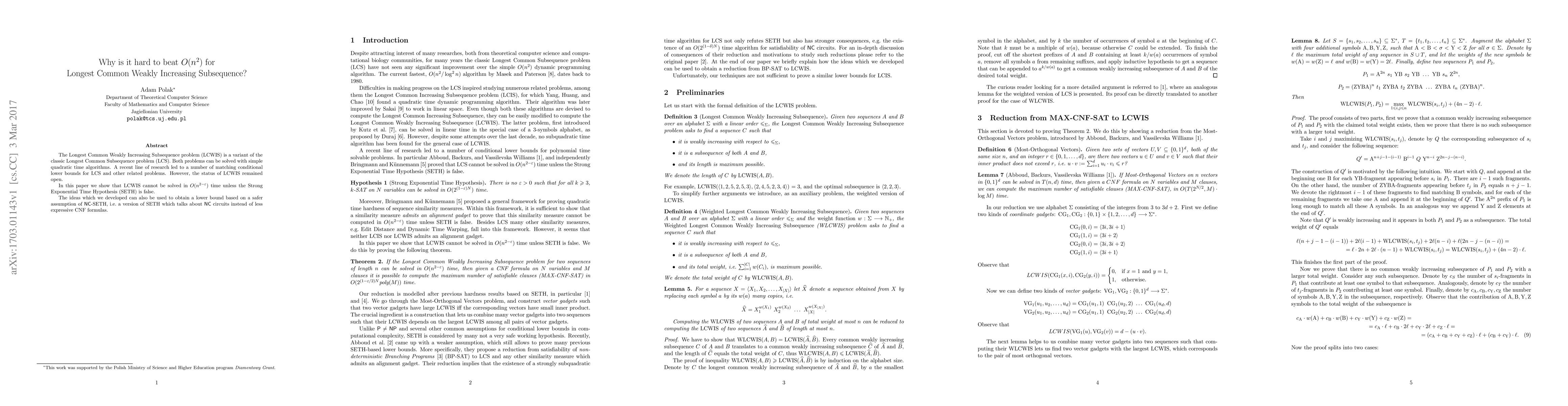 The Longest Common Weakly Increasing Subsequence problem (LCWIS) is a variant of the classic Longest Common Subsequence problem (LCS). Both problems can be solved with simple quadratic time algorithms. A recent line of research led to a number of matching conditional lower bounds for LCS and other related problems. However, the status of LCWIS remained open. In this paper we show that LCWIS cannot be solved in strongly subquadratic time unless the Strong Exponential Time Hypothesis (SETH) is false. The ideas which we developed can also be used to obtain a lower bound based on a safer assumption of NC-SETH, i.e. a version of SETH which talks about NC circuits instead of less expressive CNF formulas.