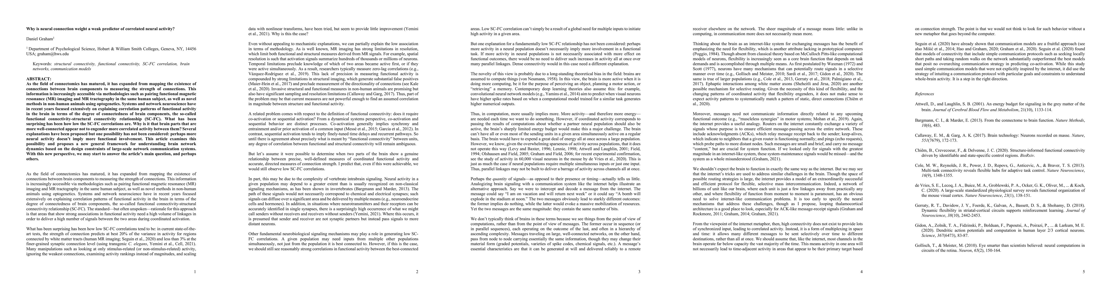 As the field of connectomics has matured, it has expanded from mapping the existence of connections between brain components to measuring the strength of connections. This information is increasingly accessible via methodologies such as pairing functional magnetic resonance (MR) imaging and MR tractography in the same human subject, as well as novel methods in non-human animals using optogenetics. Systems and network neuroscience have in recent years focused extensively on explaining correlation patterns of functional activity in the brain in terms of the degree of connectedness of brain components, the so-called functional connectivity-structural connectivity relationship (SC-FC). What has been surprising has been how low the SC-FC correlations are. Why is it that brain parts that are more well-connected appear not to engender more correlated activity between them? Several explanations have been proposed but one possibility has not been considered: perhaps more neural activity doesn't imply more functional involvement. This article examines this possibility and proposes a new general framework for understanding brain network dynamics based on the design constraints of large-scale network communication systems. With this new perspective, we may start to answer the article's main question, and perhaps others.