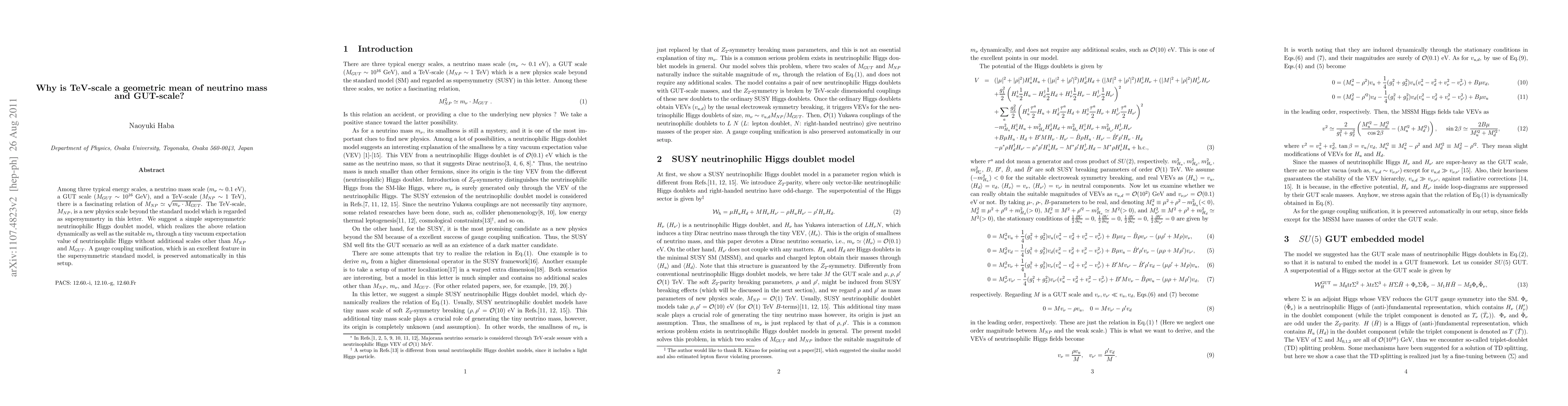 Among three typical energy scales, a neutrino mass scale ($m_\nu\sim$ 0.1 eV), a GUT scale ($M_{GUT}\sim 10^{16}$ GeV), and a TeV-scale ($M_{NP}\sim 1$ TeV), there is a fascinating relation of $M_{NP}\simeq \sqrt{m_\nu\cdot M_{GUT}}$. The TeV-scale, $M_{NP}$, is a new physics scale beyond the standard model which is regarded as supersymmetry in this letter. We suggest a simple supersymmetric neutrinophilic Higgs doublet model, which realizes the above relation dynamically as well as the suitable $m_\nu$ through a tiny vacuum expectation value of neutrinophilic Higgs without additional scales other than $M_{NP}$ and $M_{GUT}$. A gauge coupling unification, which is an excellent feature in the supersymmetric standard model, is preserved automatically in this setup.