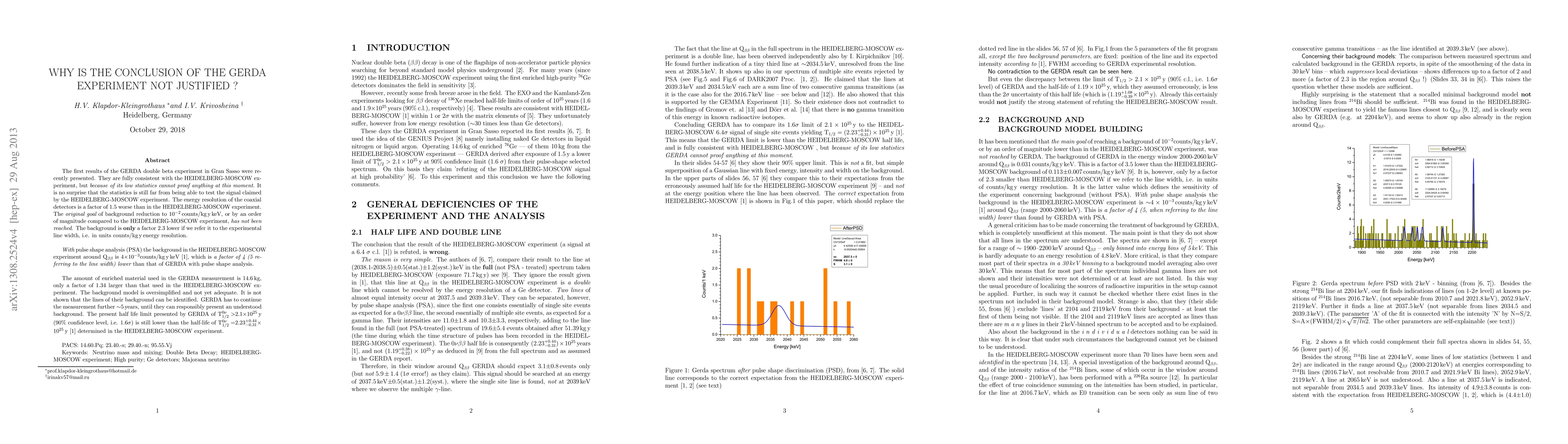 The first results of the GERDA double beta experiment in Gran Sasso were recently presented. They are fully consistent with the Heidelberg-Moscow experiment, but because of its low statistics cannot proof anything at this moment. It is no surprise that the statistics is still far from being able to test the signal claimed by the HEIDELBERG-MOSCOW experiment. The energy resolution of the coaxial detectors is a factor of 1.5 worse than in the HEIDELBERG-MOSCOW experiment. The original goal of background reduction to 10^{-2}counts/kgykeV, or by an order of magnitude compared to the HEIDELBERG-MOSCOW experiment, has not been reached. The background is only a factor 2.3 lower if we refer it to the experimental line width, i.e. in units counts/kgy energy resolution. With pulse shape analysis (PSA) the background in the HEIDELBERG-MOSCOW experiment around Q_{\beta\beta} is 4x10^{-3} counts/kgykeV \cite{HVKK-IVK-MPhLA2006}, which is a factor of 4 (5 referring to the line width) lower than that of GERDA with pulse shape analysis. The amount of enriched material used in the GERDA measurement is 14.6kg, only a factor of 1.34 larger than that used in the HM experiment. The background model is oversimplified and not yet adequate. It is not shown that the lines of their background can be identified. GERDA has to continue the measurement further ~5years, until they can responsibly present an understood background. The present half life limit presented by GERDA of T_{1/2}^{0\nu} > 2.1 x 10^{25} y (90% confidence level, i.e. 1.6sigma)) is still lower than the half-life of T_{1/2}^{0\nu} = 2.23^{{+0.44}_{-0.31}} x 10^{25} y \cite{HVKK-IVK-MPhLA2006} determined in the HEIDELBERG-MOSCOW experiment.