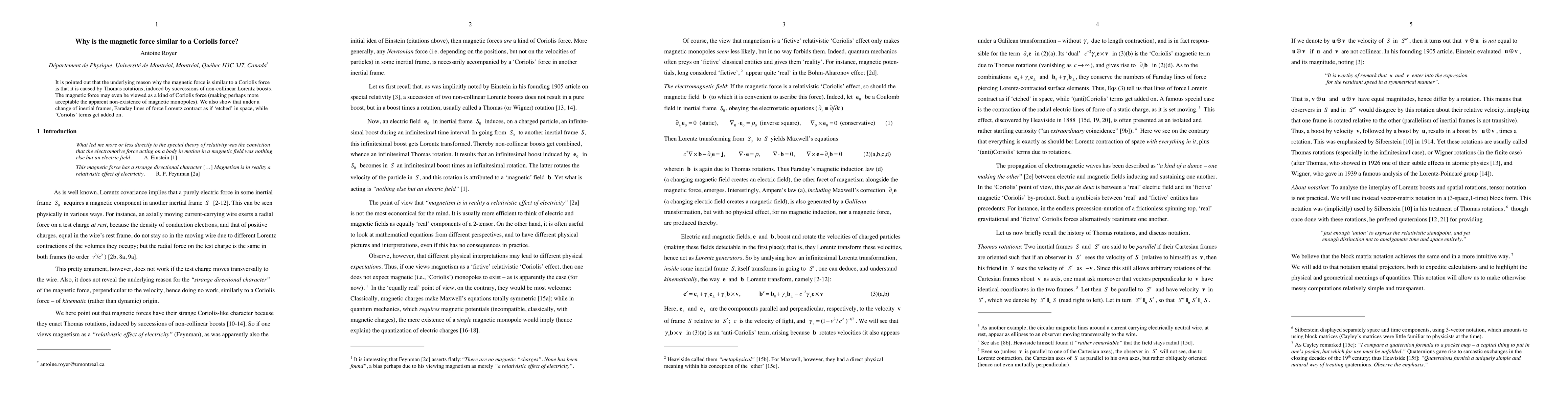 The magnetic force is analogous to a Coriolis force due to Thomas rotations from successive non-collinear Lorentz boosts, potentially explaining the absence of magnetic monopoles. Faraday lines of force contract under inertial frame changes, with 'Coriolis' terms added.