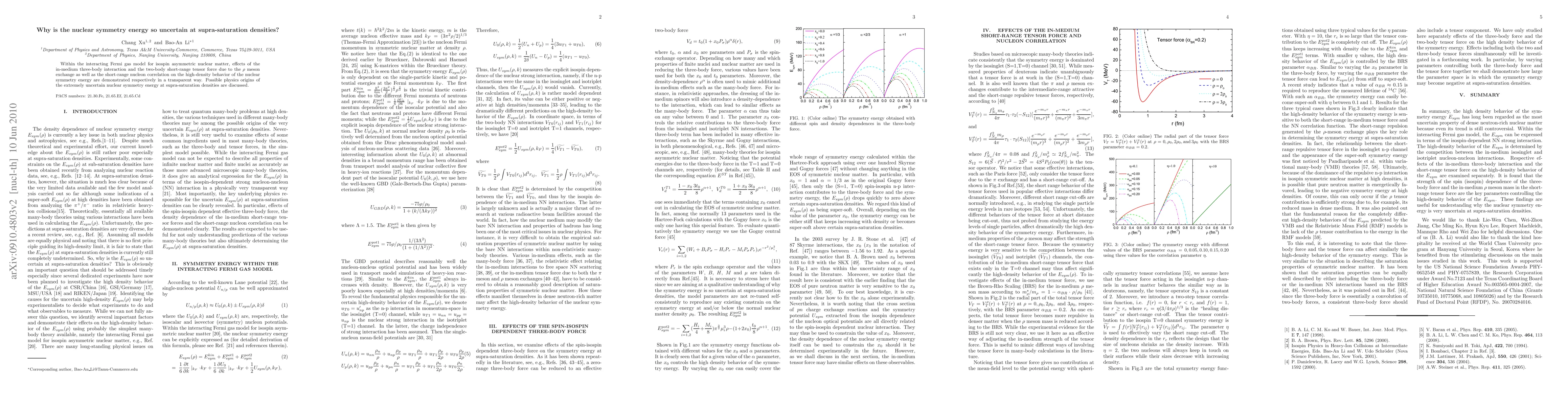 Within the interacting Fermi gas model for isospin asymmetric nuclear matter, effects of the in-medium three-body interaction and the two-body short-range tensor force due to the $\rho$ meson exchange as well as the short-range nucleon correlation on the high-density behavior of the nuclear symmetry energy are demonstrated respectively in a transparent way. Possible physics origins of the extremely uncertain nuclear symmetry energy at supra-saturation densities are discussed.