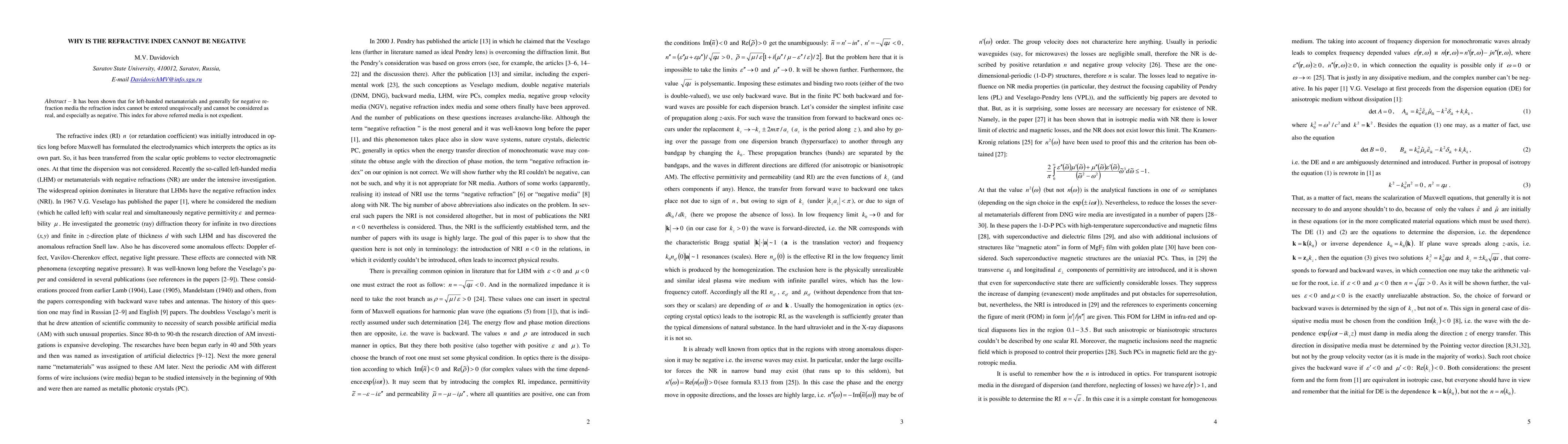 It has been shown that for left-handed metamaterials and generally for negative refraction media the refraction index cannot be entered unequivocally and cannot be considered as real, and especially as negative. This index for above referred media is not expedient