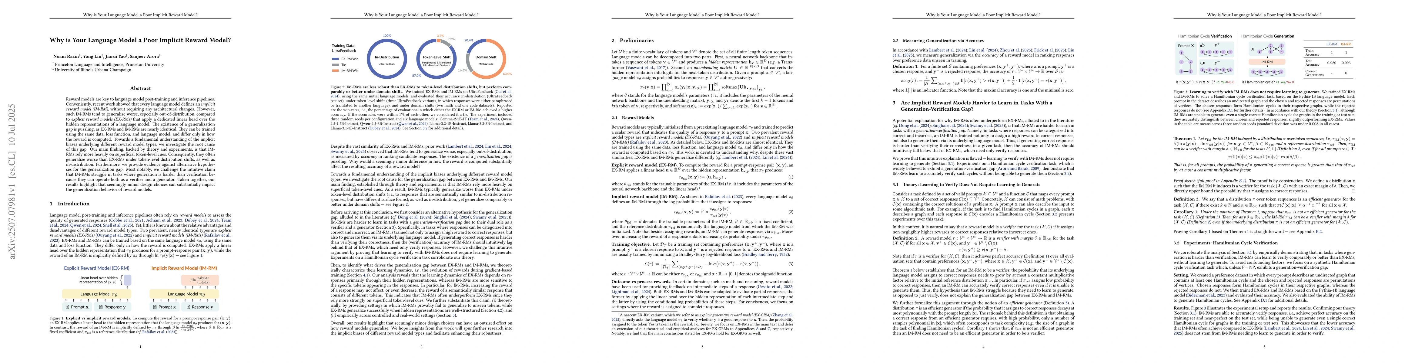Reward models are key to language model post-training and inference pipelines. Conveniently, recent work showed that every language model defines an implicit reward model (IM-RM), without requiring any architectural changes. However, such IM-RMs tend to generalize worse, especially out-of-distribution, compared to explicit reward models (EX-RMs) that apply a dedicated linear head over the hidden representations of a language model. The existence of a generalization gap is puzzling, as EX-RMs and IM-RMs are nearly identical. They can be trained using the same data, loss function, and language model, and differ only in how the reward is computed. Towards a fundamental understanding of the implicit biases underlying different reward model types, we investigate the root cause of this gap. Our main finding, backed by theory and experiments, is that IM-RMs rely more heavily on superficial token-level cues. Consequently, they often generalize worse than EX-RMs under token-level distribution shifts, as well as in-distribution. Furthermore, we provide evidence against alternative hypotheses for the generalization gap. Most notably, we challenge the intuitive claim that IM-RMs struggle in tasks where generation is harder than verification because they can operate both as a verifier and a generator. Taken together, our results highlight that seemingly minor design choices can substantially impact the generalization behavior of reward models.