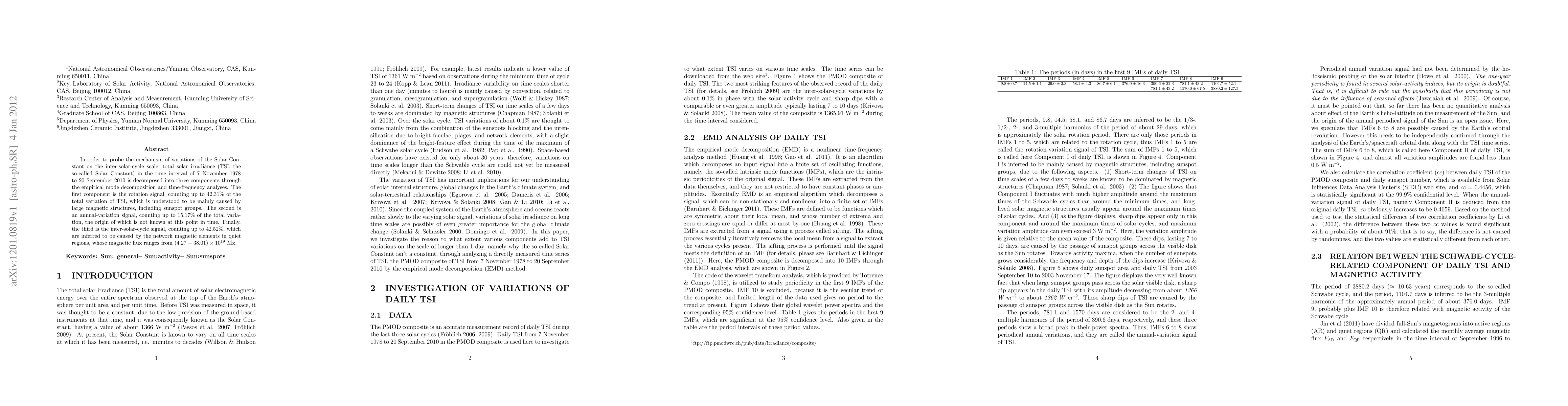 In order to probe the mechanism of variations of the Solar Constant on the inter-solar-cycle scale, total solar irradiance (TSI, the so-called Solar Constant) in the time interval of 7 November 1978 to 20 September 2010 is decomposed into three components through the empirical mode decomposition and time-frequency analyses. The first component is the rotation signal, counting up to 42.31% of the total variation of TSI, which is understood to be mainly caused by large magnetic structures, including sunspot groups. The second is an annual-variation signal, counting up to 15.17% of the total variation, the origin of which is not known at this point in time. Finally, the third is the inter-solar-cycle signal, counting up to 42.52%, which are inferred to be caused by the network magnetic elements in quiet regions, whose magnetic flux ranges from $(4.27-38.01)\times10^{19}$ Mx.