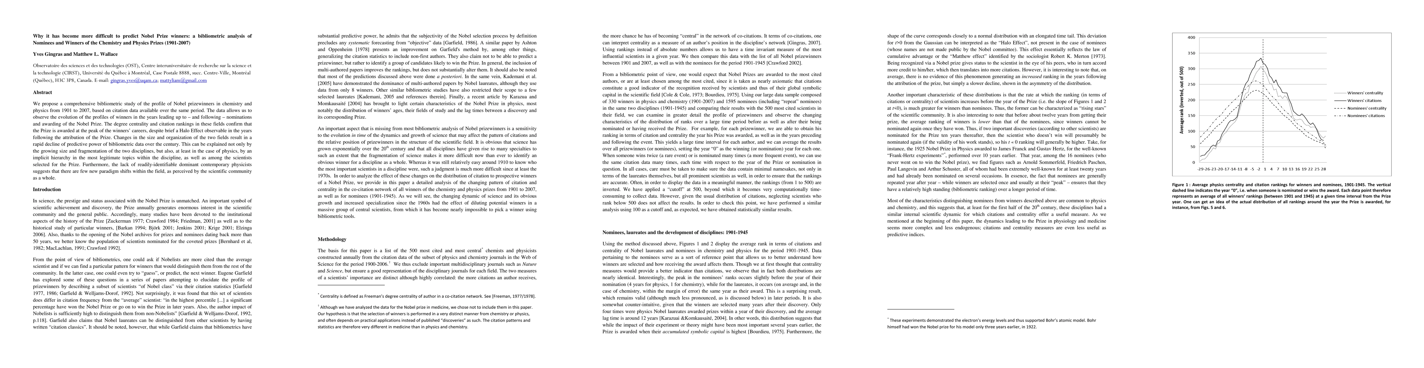 We propose a comprehensive bibliometric study of the profile of Nobel prizewinners in chemistry and physics from 1901 to 2007, based on citation data available over the same period. The data allows us to observe the evolution of the profiles of winners in the years leading up to (and following) nominations and awarding of the Nobel Prize. The degree centrality and citation rankings in these fields confirm that the Prize is awarded at the peak of the winners' careers, despite brief a Halo Effect observable in the years following the attribution of the Prize. Changes in the size and organization of the two fields result in a rapid decline of predictive power of bibliometric data over the century. This can be explained not only by the growing size and fragmentation of the two disciplines, but also, at least in the case of physics, by an implicit hierarchy in the most legitimate topics within the discipline, as well as among the scientists selected for the Prize. Furthermore, the lack of readily-identifiable dominant contemporary physicists suggests that there are few new paradigm shifts within the field, as perceived by the scientific community as a whole.