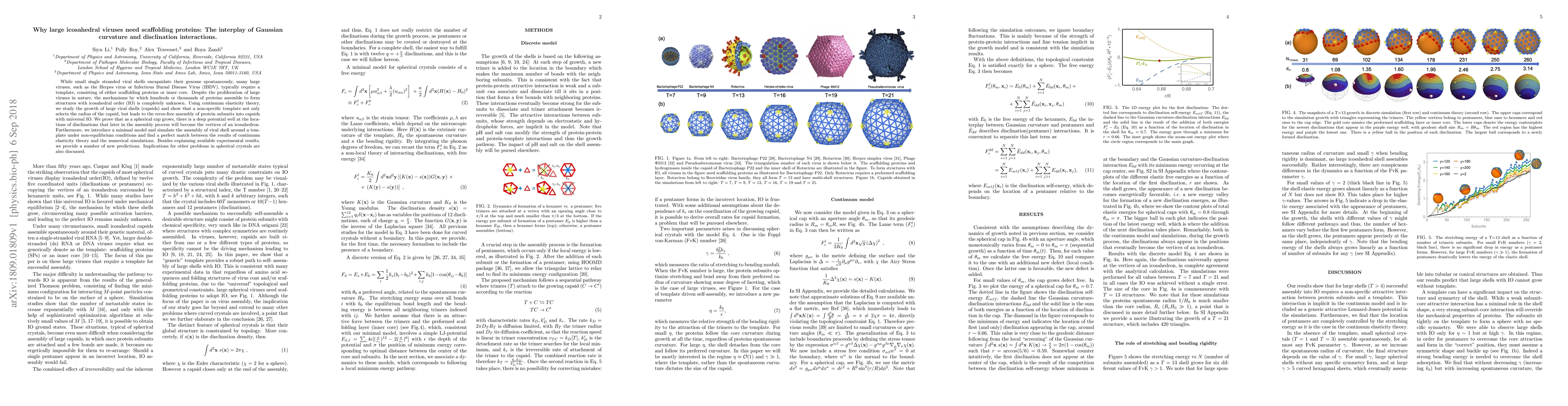 This paper explores the necessity of scaffolding proteins in large icosahedral viruses, demonstrating that a non-specific template guides the assembly of viral capsids through Gaussian curvature and disclination interactions. The study combines continuum elasticity theory with numerical simulations to predict the error-free assembly of protein subunits into icosahedral structures.