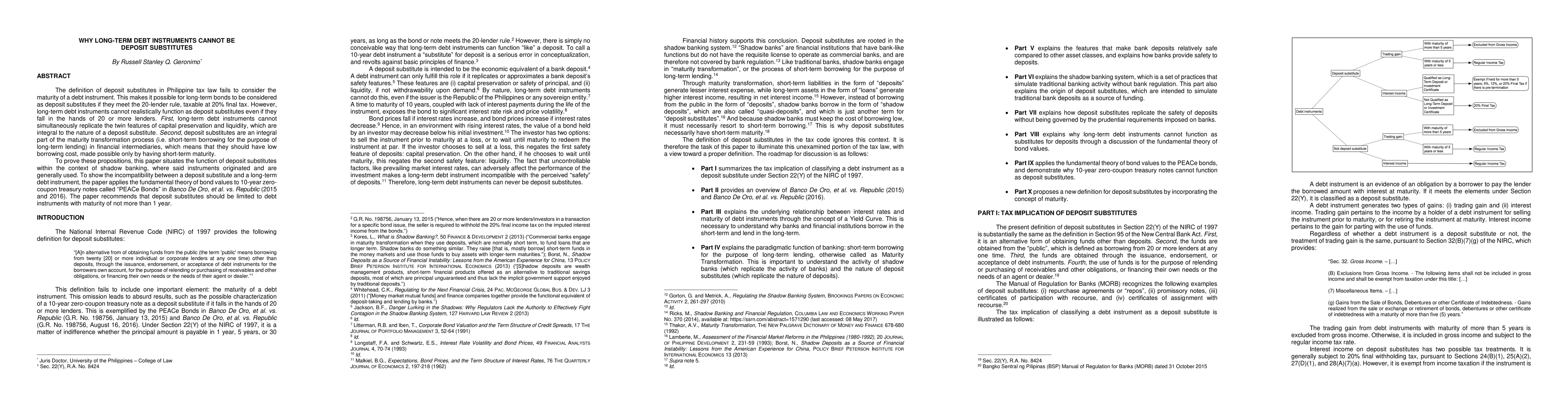 The definition of deposit substitutes in Philippine tax law fails to consider the maturity of a debt instrument. This makes it possible for long-term bonds to be considered as deposit substitutes if they meet the 20-lender rule, taxable at 20% final tax. However, long-term debt instruments cannot realistically function as deposit substitutes even if they fall in the hands of 20 or more lenders. First, long-term debt instruments cannot simultaneously replicate the twin features of capital preservation and liquidity, which are integral to the nature of a deposit substitute. Second, deposit substitutes are an integral part of the maturity transformation process (i.e. short-term borrowing for the purpose of long-term lending) in financial intermediaries, which means that they should have low borrowing cost, made possible only by having short-term maturity. To prove these propositions, this paper situates the function of deposit substitutes within the context of shadow banking, where said instruments originated and are generally used. To show the incompatibility between a deposit substitute and a long-term debt instrument, the paper applies the fundamental theory of bond values to 10-year zero-coupon treasury notes called 'PEACe Bonds' in Banco De Oro, et al. vs. Republic (2015 and 2016). The paper recommends that deposit substitutes should be limited to debt instruments with maturity of not more than 1 year.
