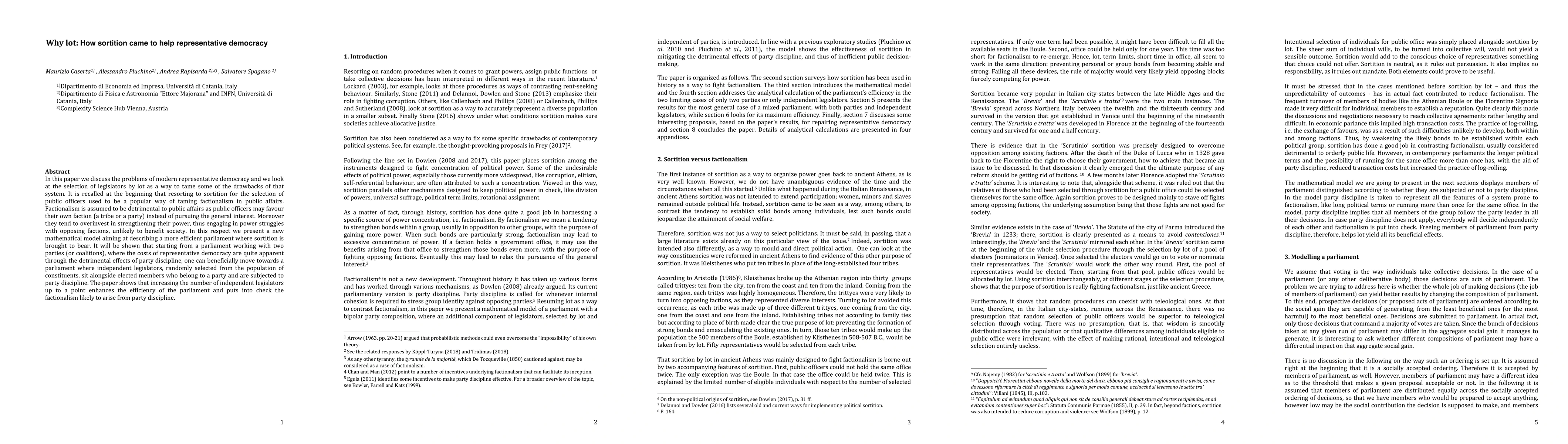 In this paper we discuss the problems of modern representative democracy and we look at the selection of legislators by lot as a way to tame some of the drawbacks of that system. It is recalled at the beginning that resorting to sortition for the selection of public officers used to be a popular way of taming factionalism in public affairs. Factionalism is assumed to be detrimental to public affairs as public officers may favour their own faction (a tribe or a party) instead of pursuing the general interest. Moreover they tend to overinvest in strengthening their power, thus engaging in power struggles with opposing factions, unlikely to benefit society. In this respect we present a new mathematical model aiming at describing a more efficient parliament where sortition is brought to bear. It will be shown that starting from a parliament working with two parties (or coalitions), where the costs of representative democracy are quite apparent through the detrimental effects of party discipline, one can beneficially move towards a parliament where independent legislators, randomly selected from the population of constituents, sit alongside elected members who belong to a party and are subjected to party discipline. The paper shows that increasing the number of independent legislators up to a point enhances the efficiency of the parliament and puts into check the factionalism likely to arise from party discipline.